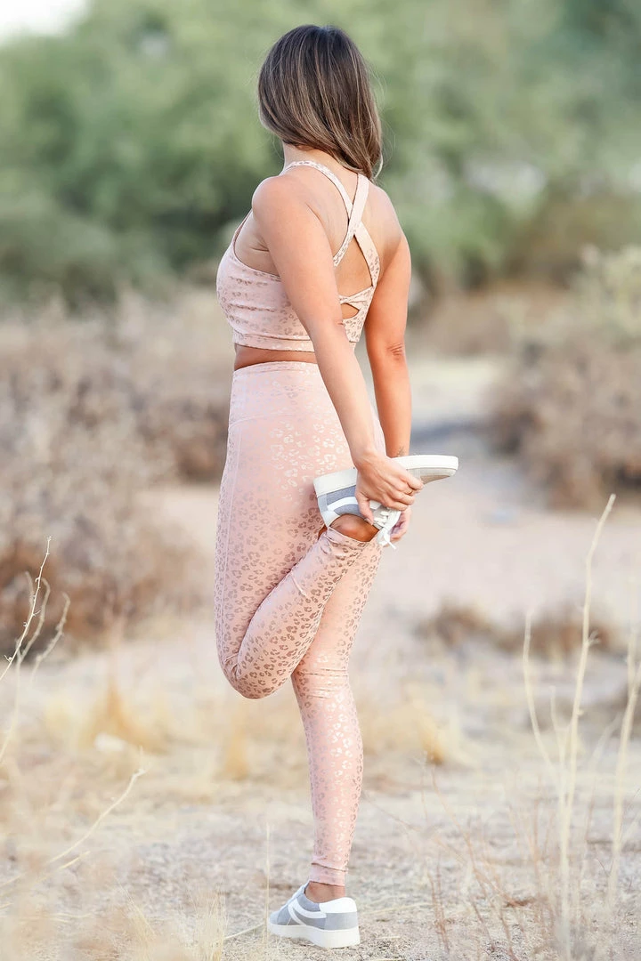 Women’s rose gold, leopard foil print activewear sports bra and leggings. Sports bra features round neckline, criss-cross straps and twist detail at back, mesh interior, and light removable padding at bust. Matching high-rise athletic leggings feature discreet open pocket and wide waist band to provide abdominal support. Moisture-wicking material.