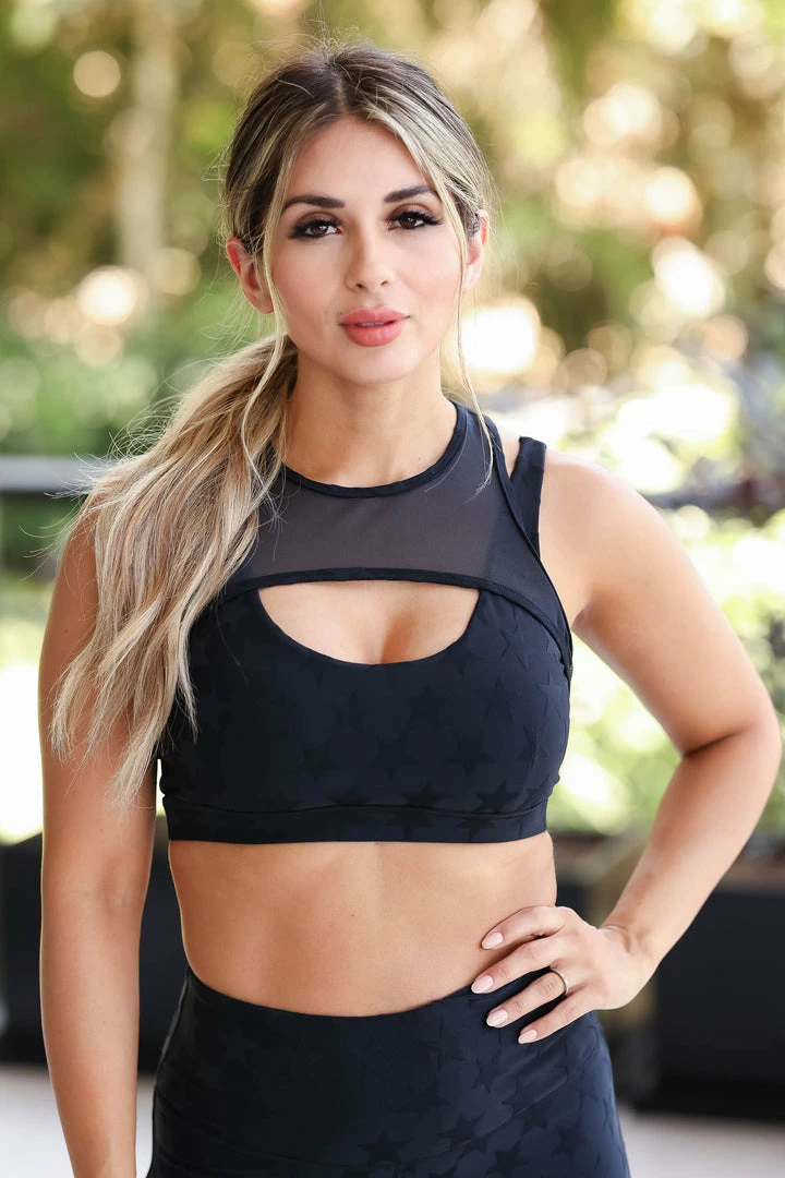 Women’s black textured star jacquard activewear sports bra and leggings. Sports bra features round neckline, mesh harness overlay, adjustable straps, and light removable padding at bust. Matching high-rise athletic leggings feature discreet open pocket and wide waist band to provide abdominal support. Moisture-wicking material.