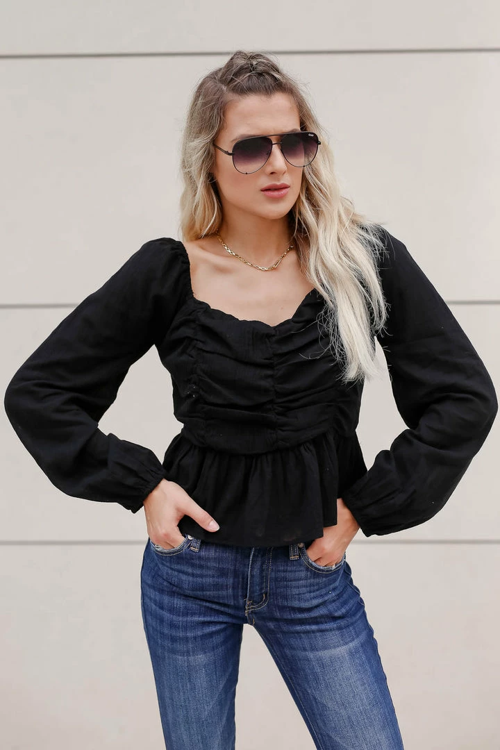 Black, long sleeve, women’s crinkled muslin woven top featuring square neckline, balloon sleeves with elastic cuffs, shirring detail at front, smocking at back, and peplum hem. Partially lined.