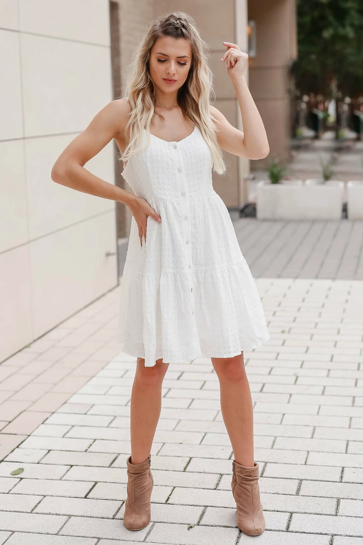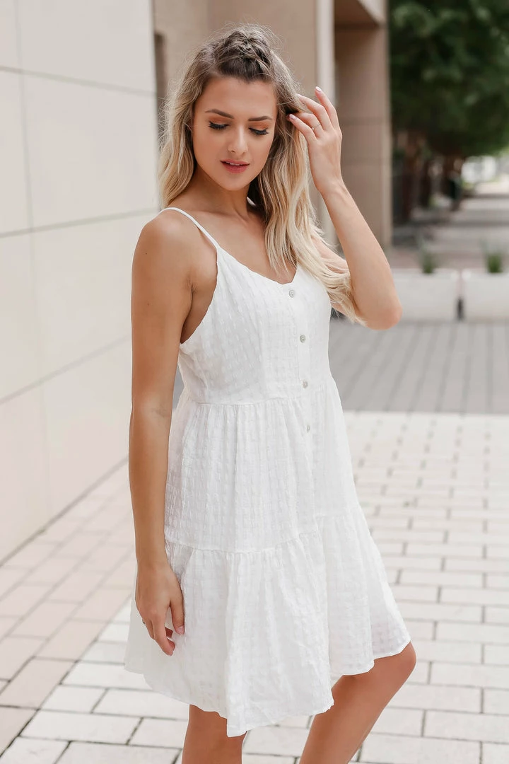 White, sleeveless, women’s textured woven dress featuring round neckline, adjustable spaghetti straps, functional button-front closure, and tiered design. Lined.