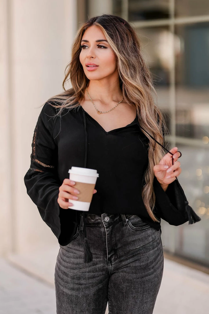 CBRAND, black, women’s woven peasant top featuring round neckline with optional self-tie closure with tassel details, raglan bell sleeves, crochet contrast on shoulders and split seam.