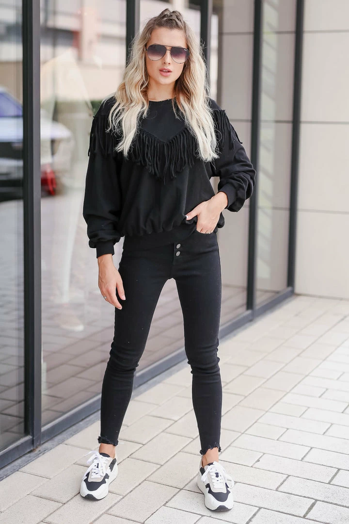Black, long sleeve, women’s pullover top featuring fringe overlay, round neckline with slight distressing, ribbed trim, and banded cuffs and hem.