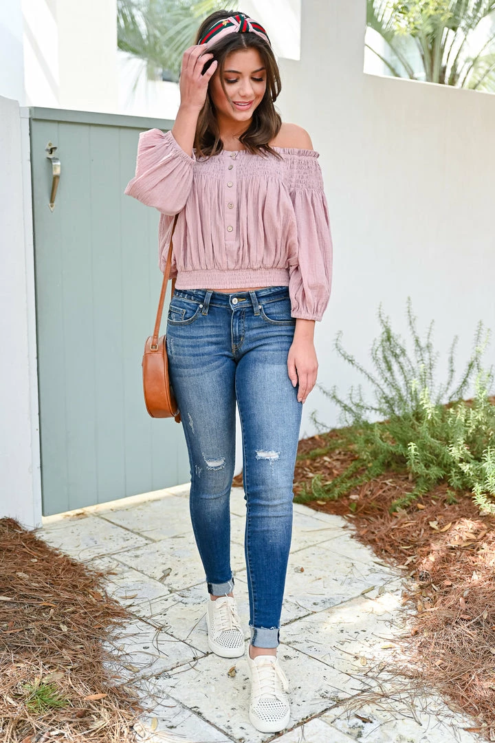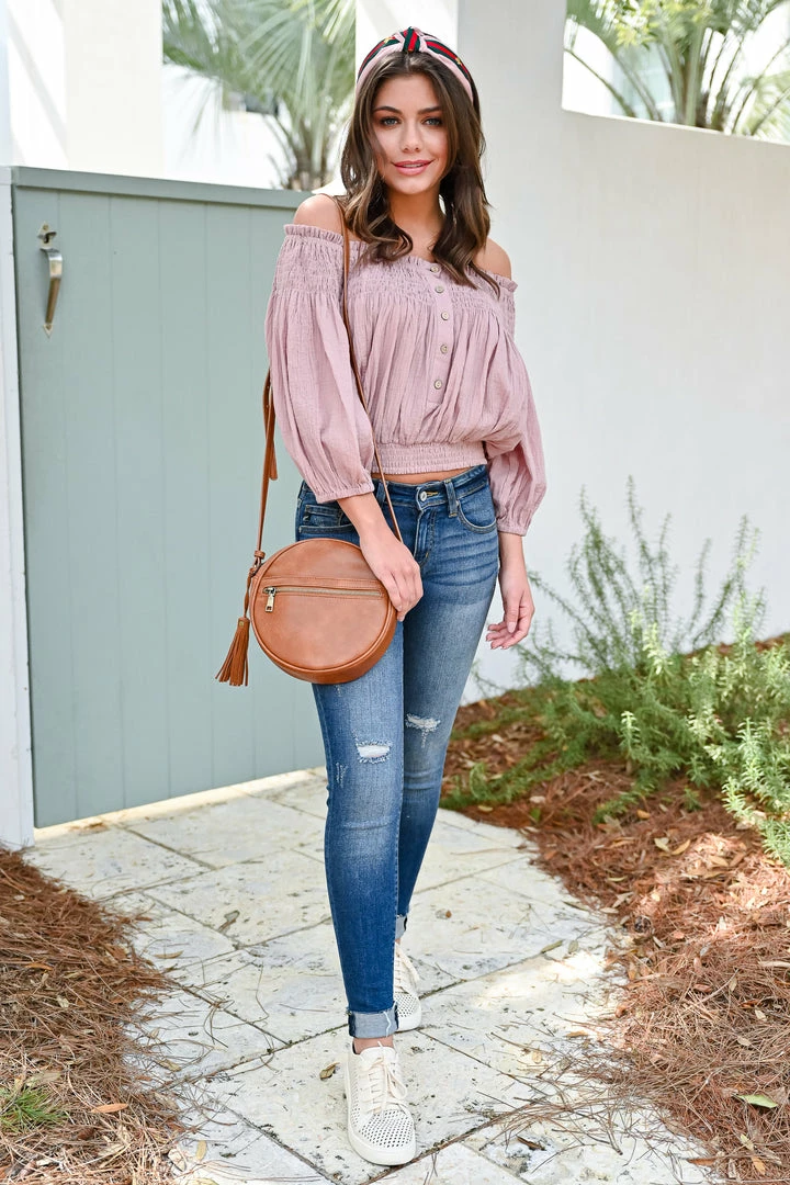 Dusty rose, off-the-shoulder, women’s woven crop top featuring smocking at neckline and hem, ruffle trim, 3/4 volume sleeves, functional button-front design, and bubble hem.