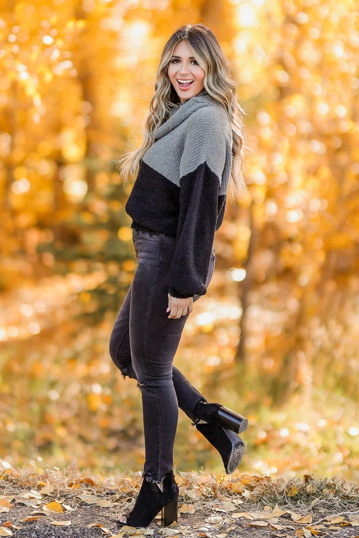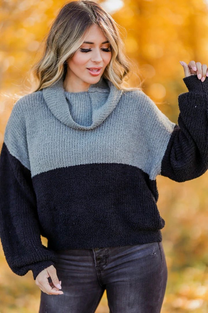 Black and grey, color block, women’s knit pullover sweater featuring cowl neck, long balloon sleeves, and drop shoulders.