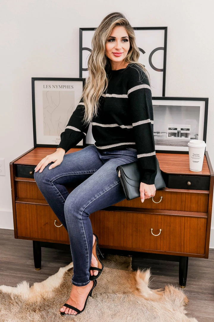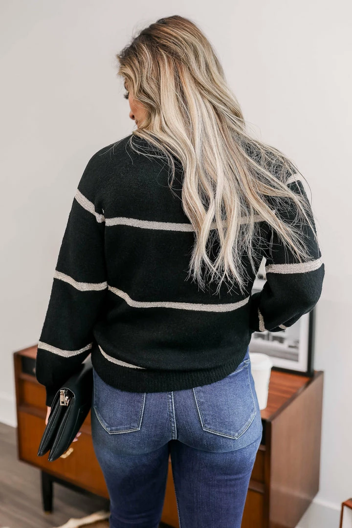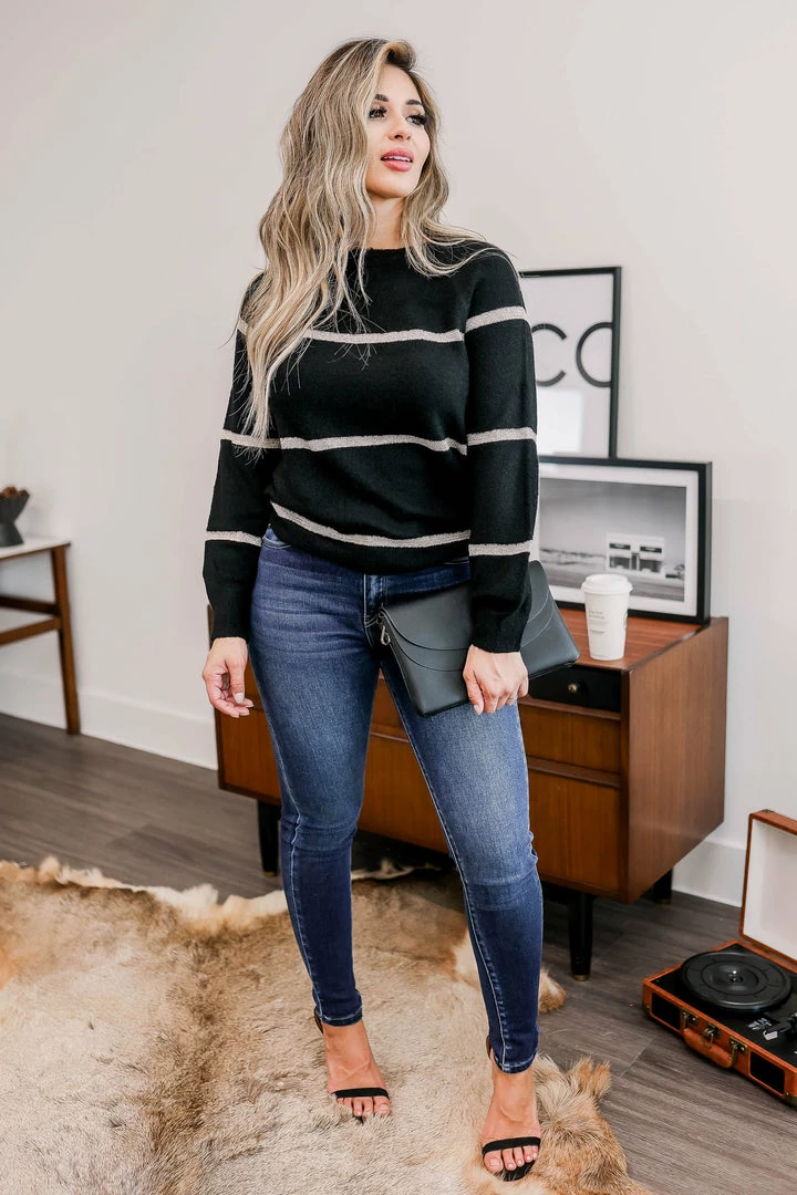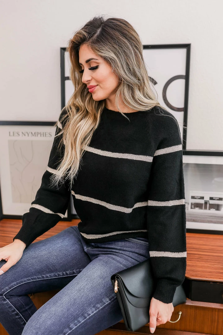 It’s your time to shine in this cute striped sweater! The metallic gold stripes give this top a subtle sparkle that’s perfect for the holiday season.Â