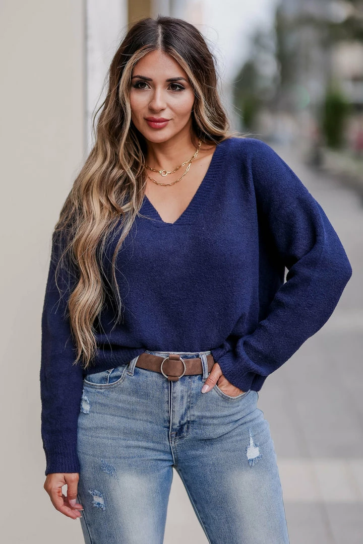 CBRAND, navy, women’s brushed knit pullover sweater featuring v-neckline, long sleeves, drop shoulder and ribbed trim.