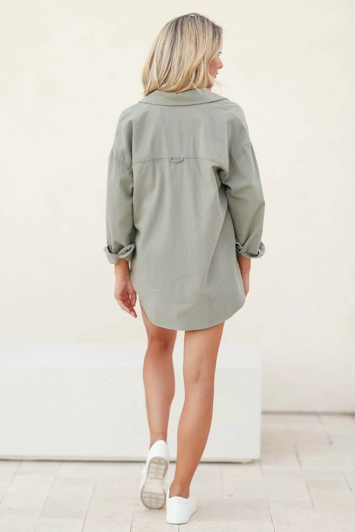 Go ahead and take it easy in this casual shacket! This is the perfect piece to toss on over a tank and shorts to take your look into nighttime. Â