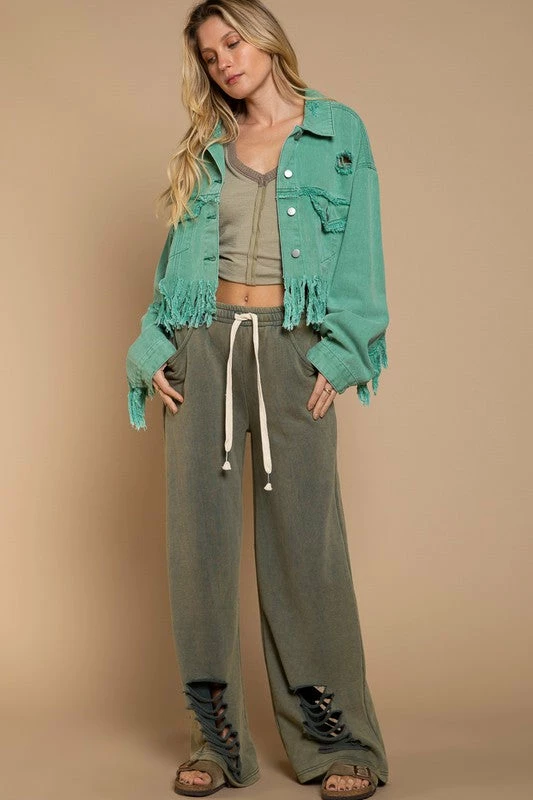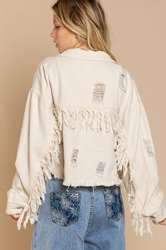 Designed in cropped, slouchy silhouette denim jacket, button closure, fringe detailing throughout on hem, distressed pocket flip detail, distressed seaming detailing on yoke. LENGTH:18 1/2″ BUST:24 1/2″.