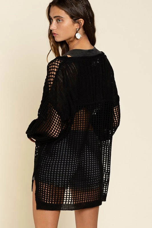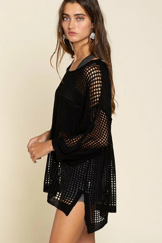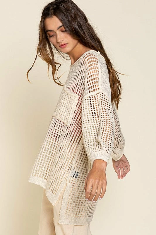Designed in see through pullover sweater with Square fishnet knitting, high low length, Oversized fit with side slit, 3/4 length super balloon sleeve rib knitted point on back yoke.