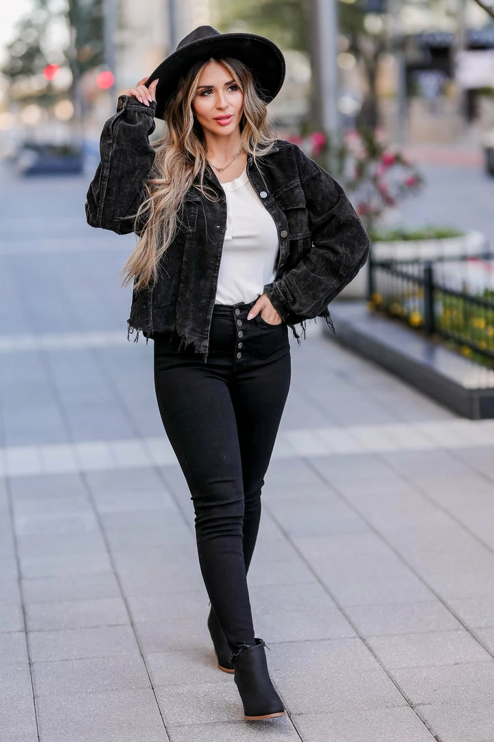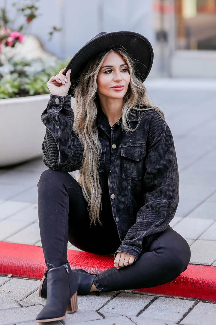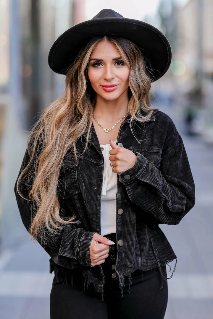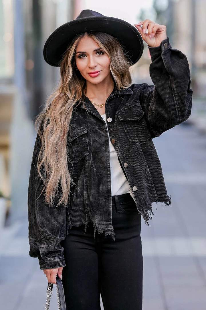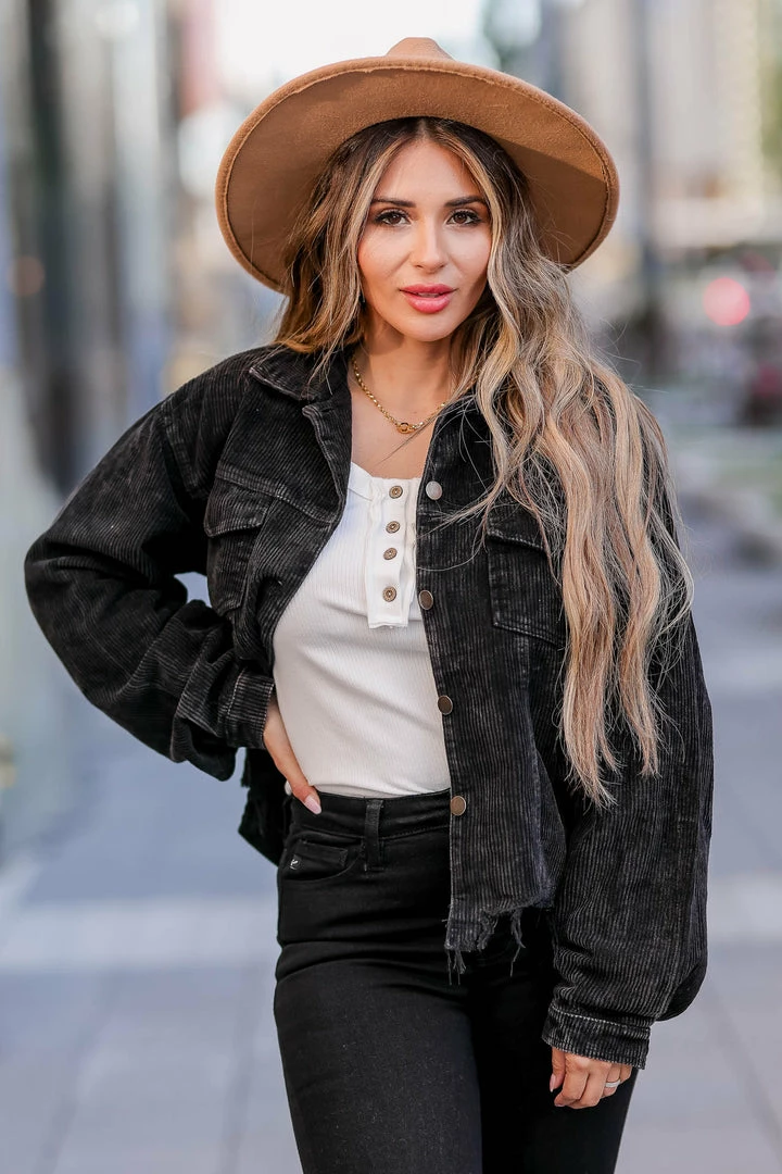Black, long sleeve, women’s corduroy shacket featuring basic collar, raw hem, button closure at front and at cuffs, and chest pockets with flap and button closure.