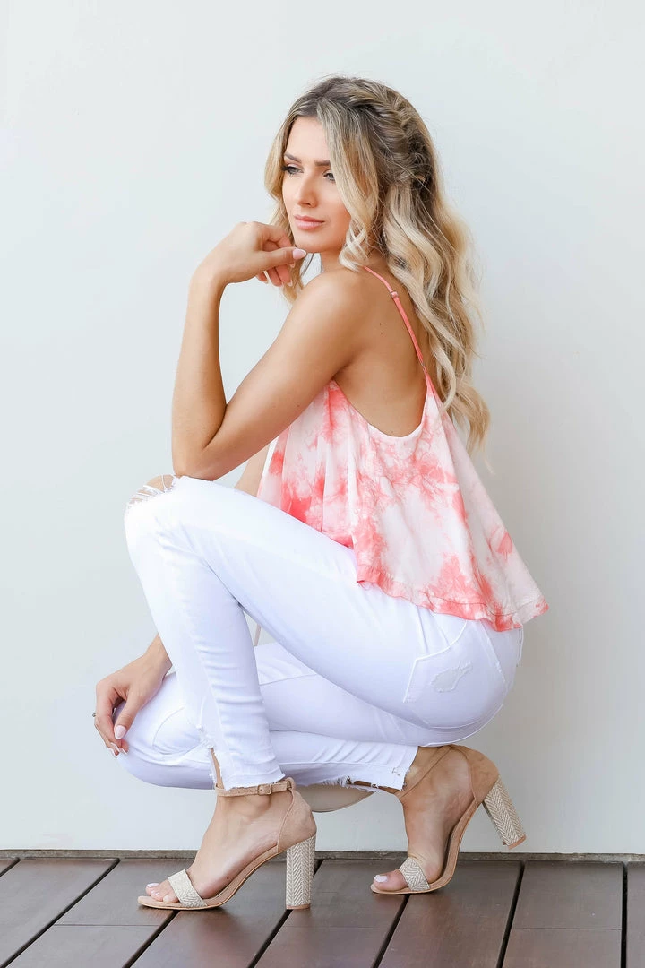 Coral, tie-dye, women’s sleeveless bodysuit featuring adjustable spaghetti straps, round neckline, ruffle overlay with raw edge detail, elastic waistband, v-back design, and snap button closure at bottom. Cheeky coverage. *Please note tie-dye coloration and placement will vary with each unique piece.