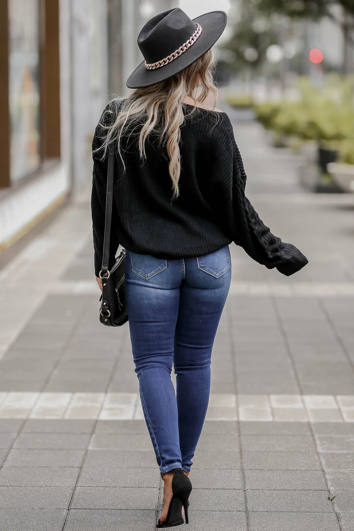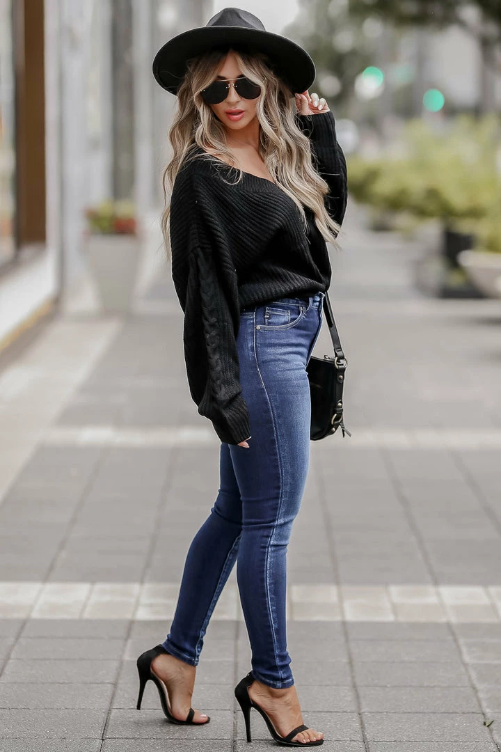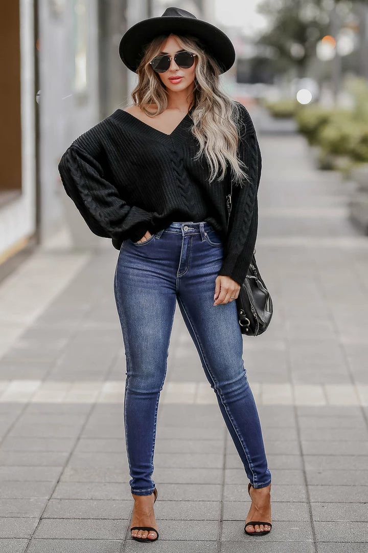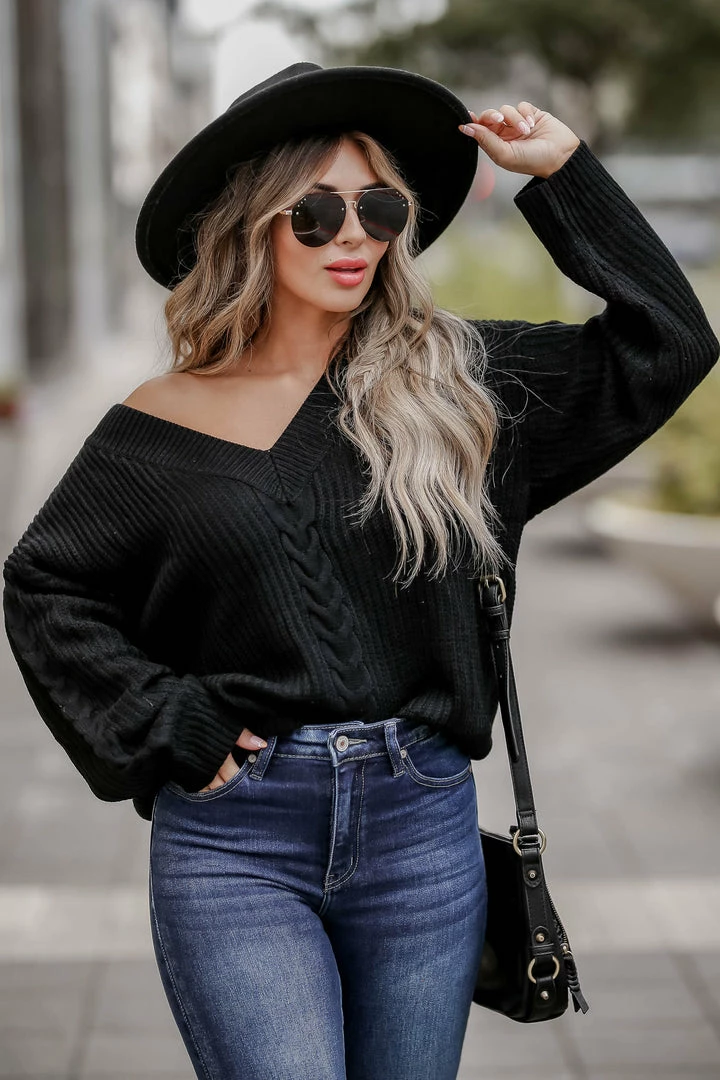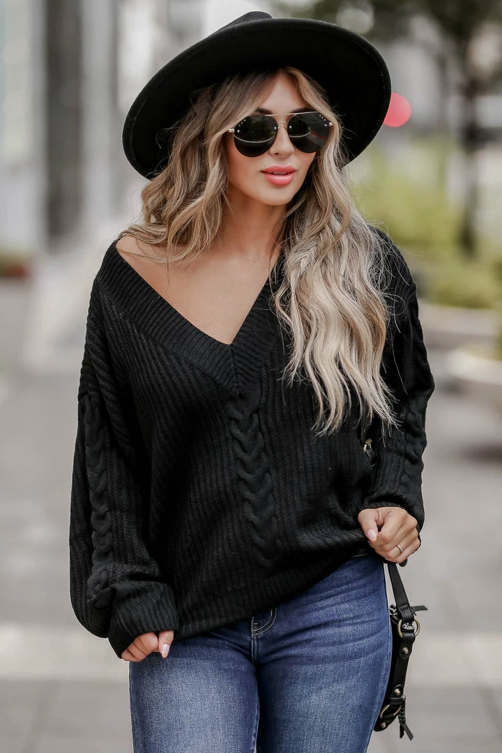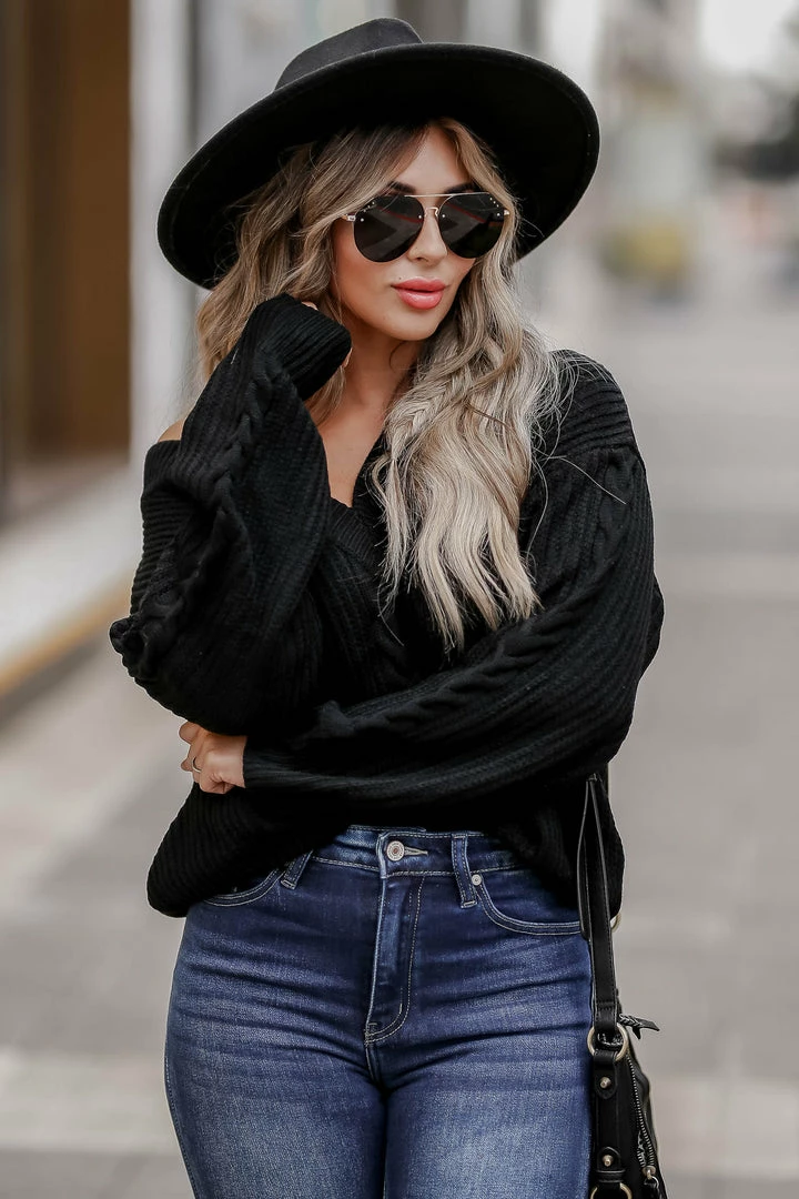 CBRAND, black, women’s knit sweater featuring v-neckline, long sleeves, drop shoulders, cable knit detailing, and ribbed trim.