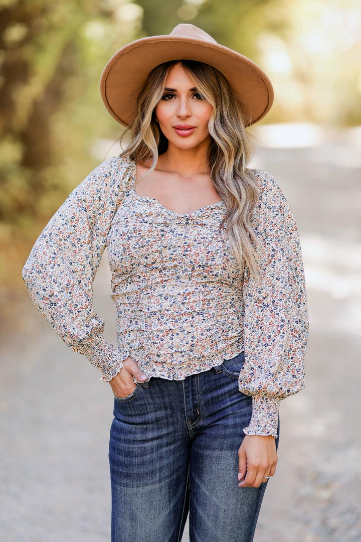 Cream, floral print, women’s woven peasant top featuring square neckline, ruched bodice, long balloon sleeves with smocked cuffs, ruffled hemline, and smocked elastic at back.