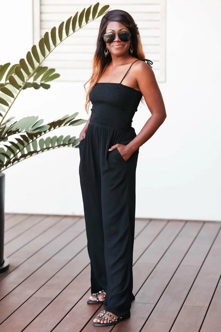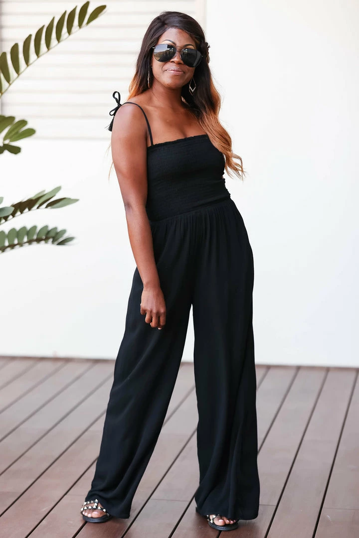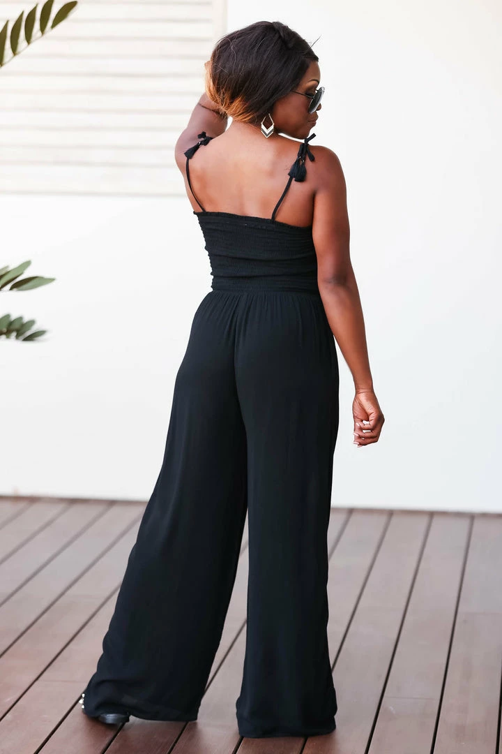 CBRAND, black, women’s sleeveless jumpsuit featuring spaghetti straps with tassel tie detail, straight neckline with ruffle trim, smocked bodice, side pockets, and wide leg design. Straps are not adjustable.