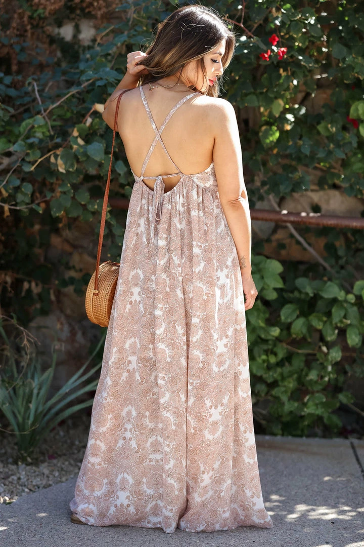 Dusty rose, paisley floral print, women’s sleeveless woven maxi dress featuring v-neckline, adjustable straps with criss-cross detail at back, empire waistline, and open back design with tie closure and elastic band. Partially lined.