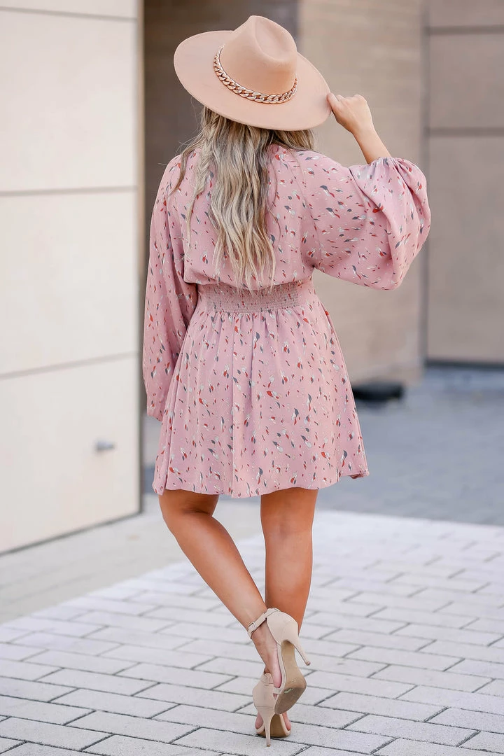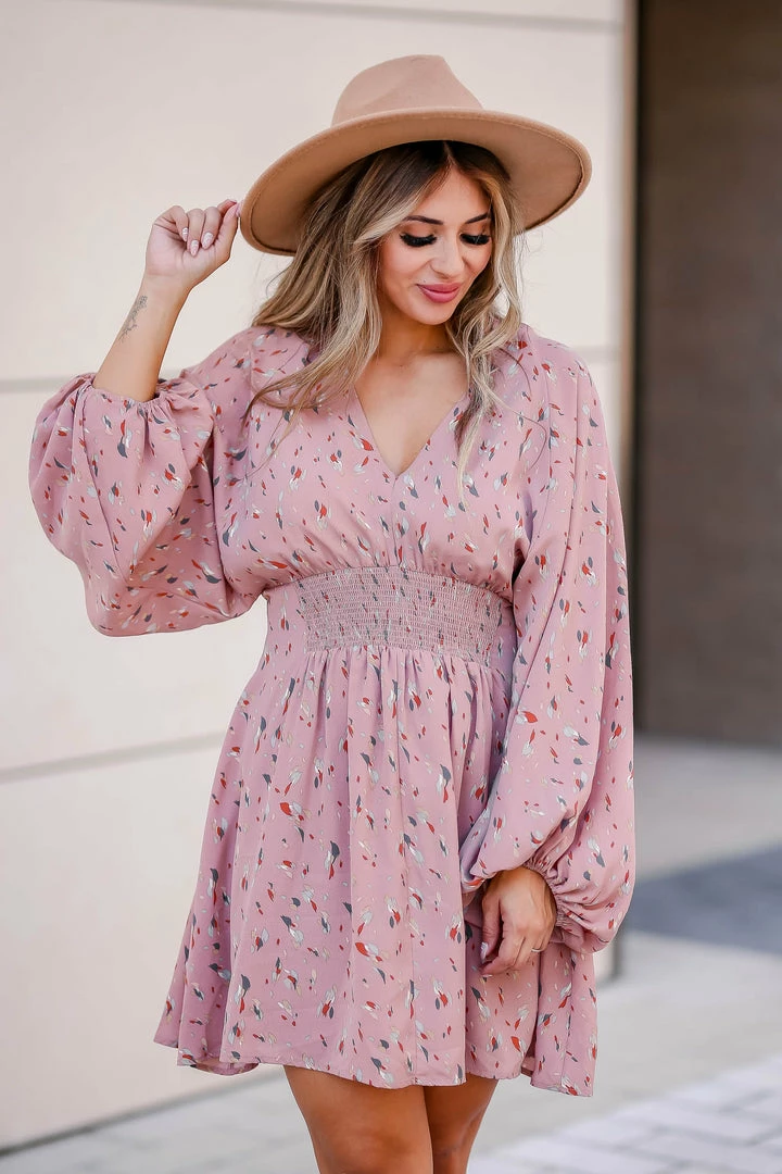 Dusty rose, abstract print, women’s woven mini dress featuring v-neckline, long bubble sleeves with elastic cuffs, and smocking at waist. Partially lined.