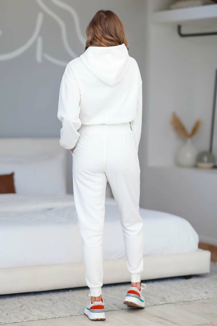 Ivory, brushed fleece matching women’s loungewear hoodie, joggers and shorts. Long sleeve, cropped hoodie features banded elastic cuff and hem. Shorts feature elastic waistband and curved hem. Relaxed fit joggers feature elastic waistband with adjustable drawstring, side pockets and banded cuff and hem. Pre-washed for a no shrink true fit.