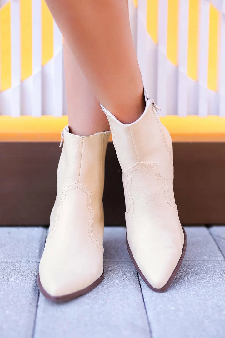 Cream, vegan leather western inspired pointed-toe ankle booties featuring sectioned elastic panel, seam details on front, zipper closure and stacked block heel.
