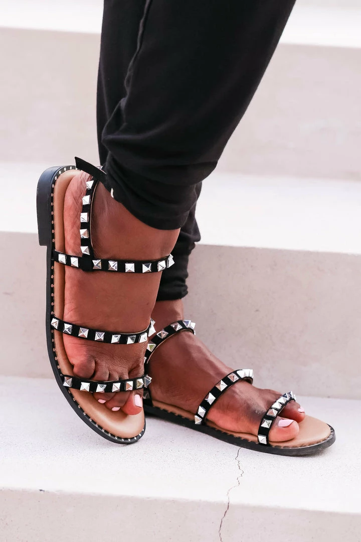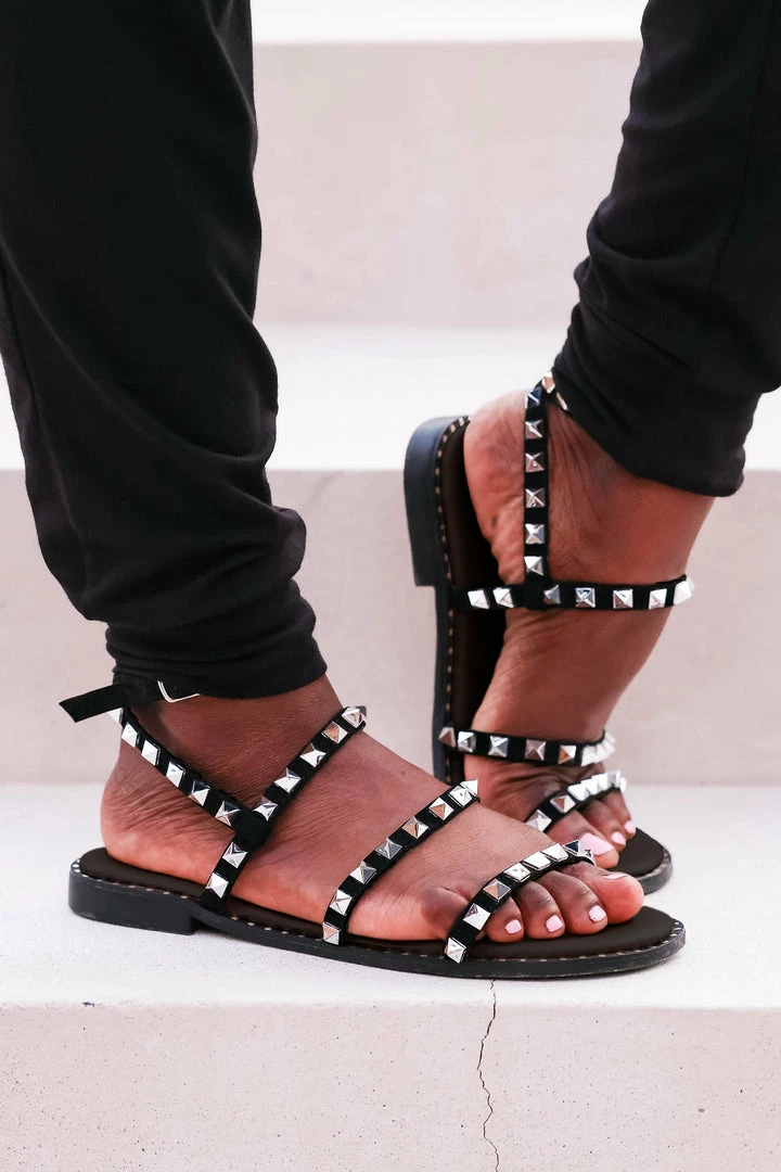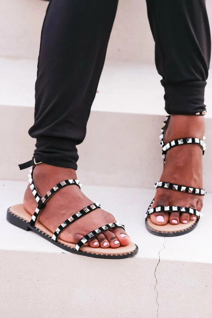Women’s black strappy sandals with stud details and buckle closure at ankle. *Please note sole color will vary as shown in photos.