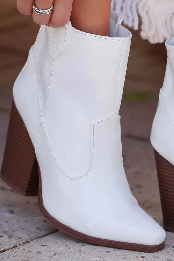 White, vegan leather, slip-on, western inspired pointed-toe ankle booties featuring faux crocodile skin detail, and stacked block heel.
