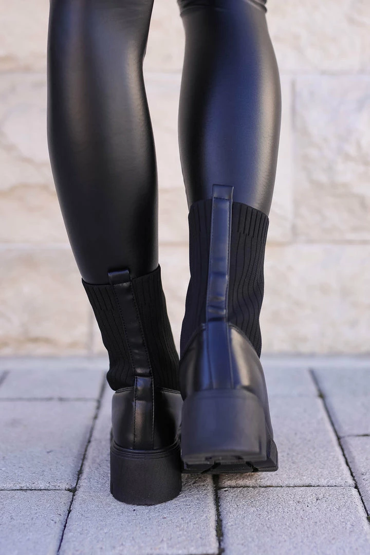 Black, women’s lace-up combat boots featuring knit contrast, chunky heel, and treaded sole.