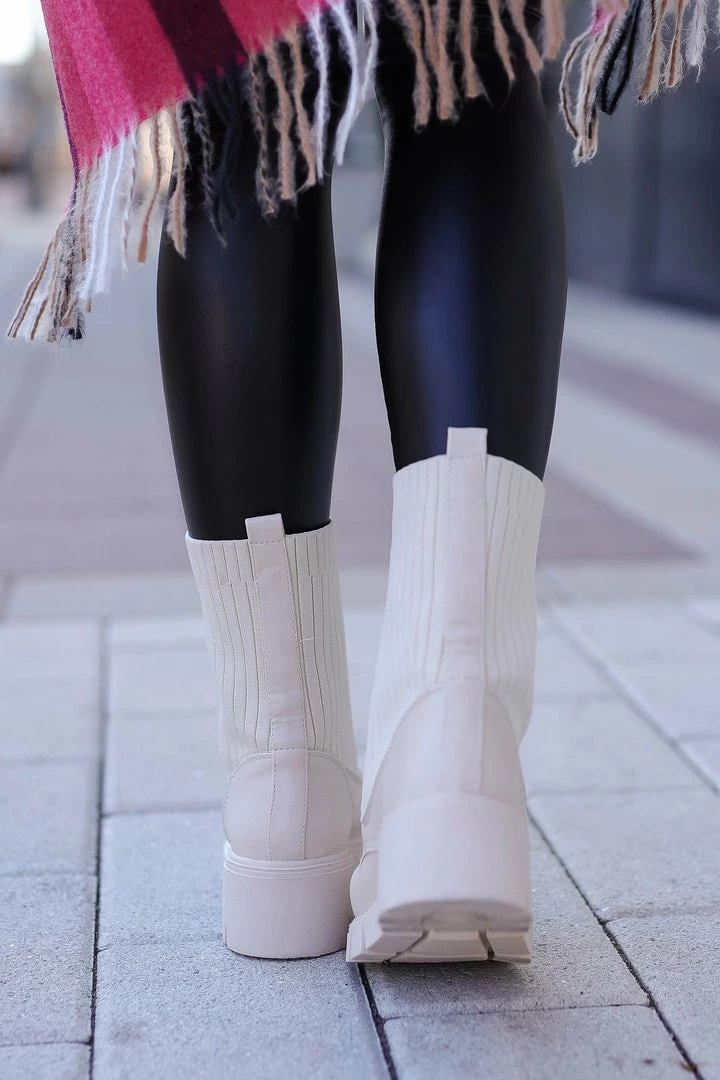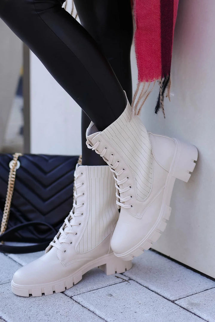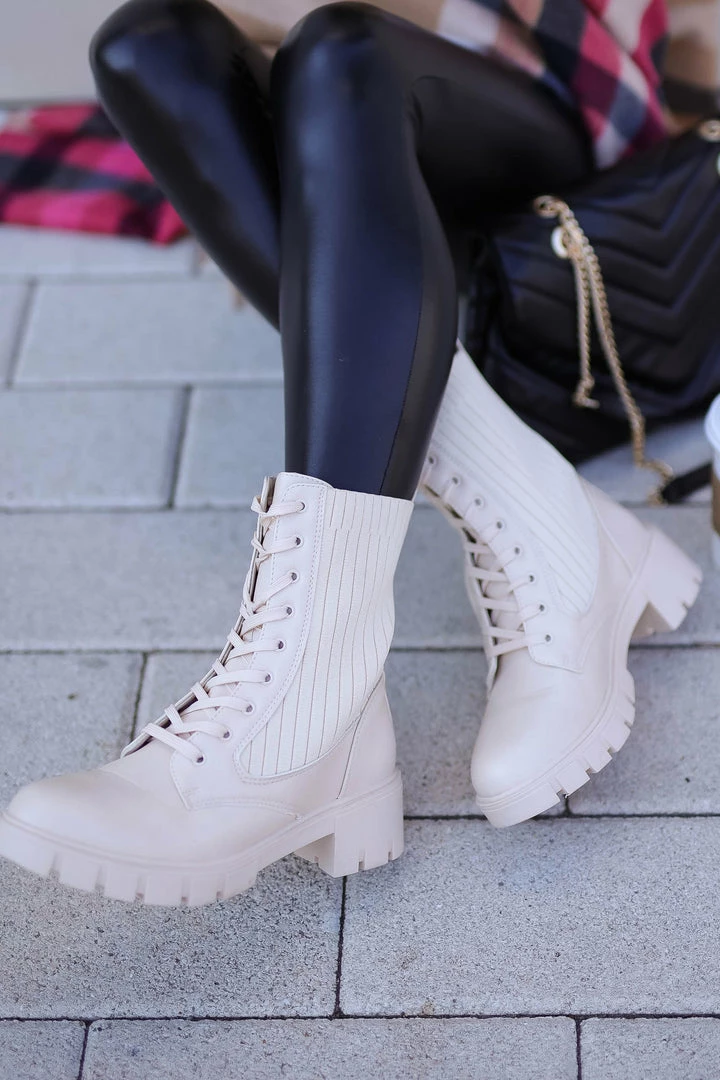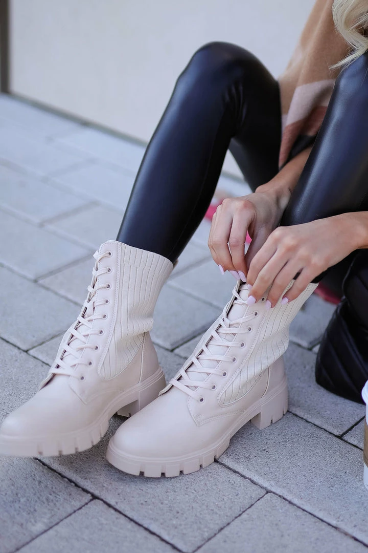 Bone, women’s lace-up combat boots featuring knit contrast, chunky heel, and treaded sole.