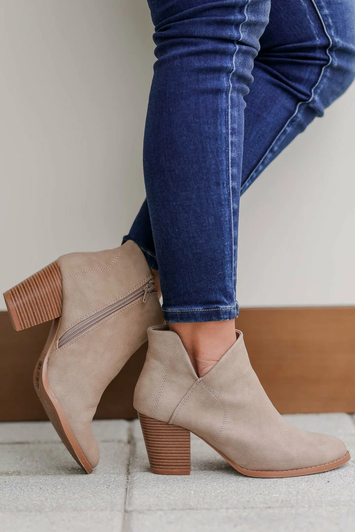 Taupe, vegan suede, women’s ankle booties featuring stitching design, side cutout detail, zipper closure, and stacked block heel.