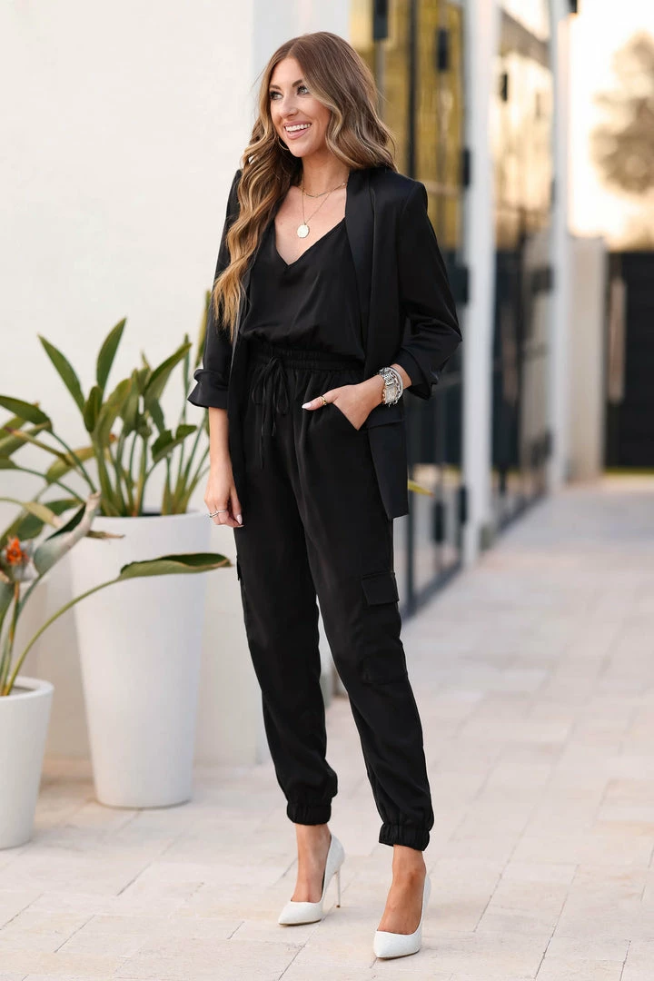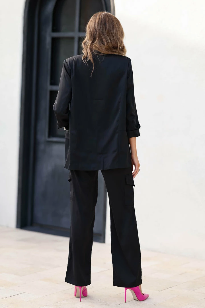 Black, women’s satin boyfriend blazer featuring dropped shawl collar, padded shoulders, ruched 3/4 sleeves, and functional front pockets with flaps. Fully lined. Matching satin straight leg cargo pants feature elastic waistband with hidden hook and eye closure with zip fly closure, belt loops, functional side pockets, and cargo pockets.