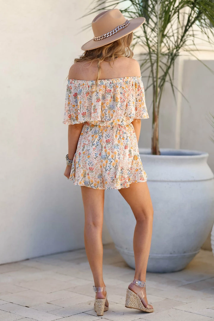 Coral, women’s floral, off the shoulder romper featuring ruffle overlay and elastic band at shoulders, elastic waistband, and godet pleated shorts. Lined.