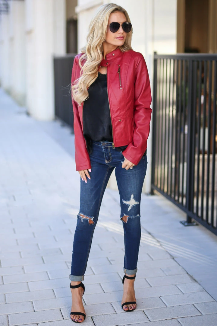 Wine, vegan leather jacket with four side-slit zipper pockets on front, zipper accents on sleeves, exposed zipper at front, and stand up collar with tab and snap closure. Accent seam details all over with double topstitch.Â