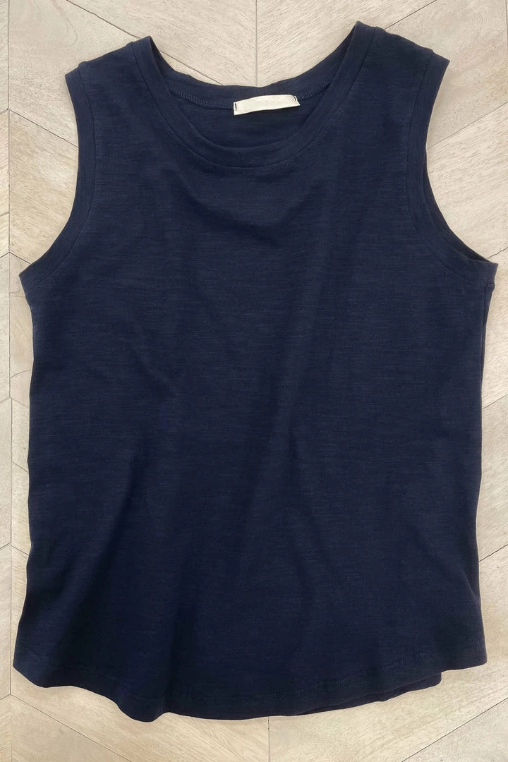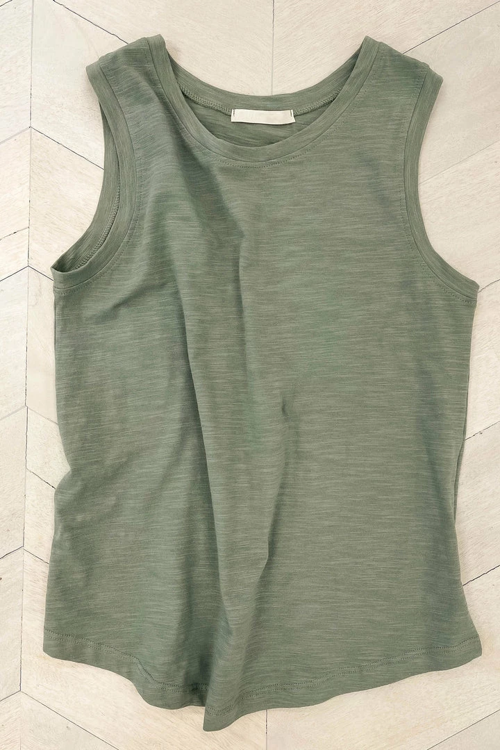 Women’s vintage wash, cotton, slub, round neck sleeveless top.