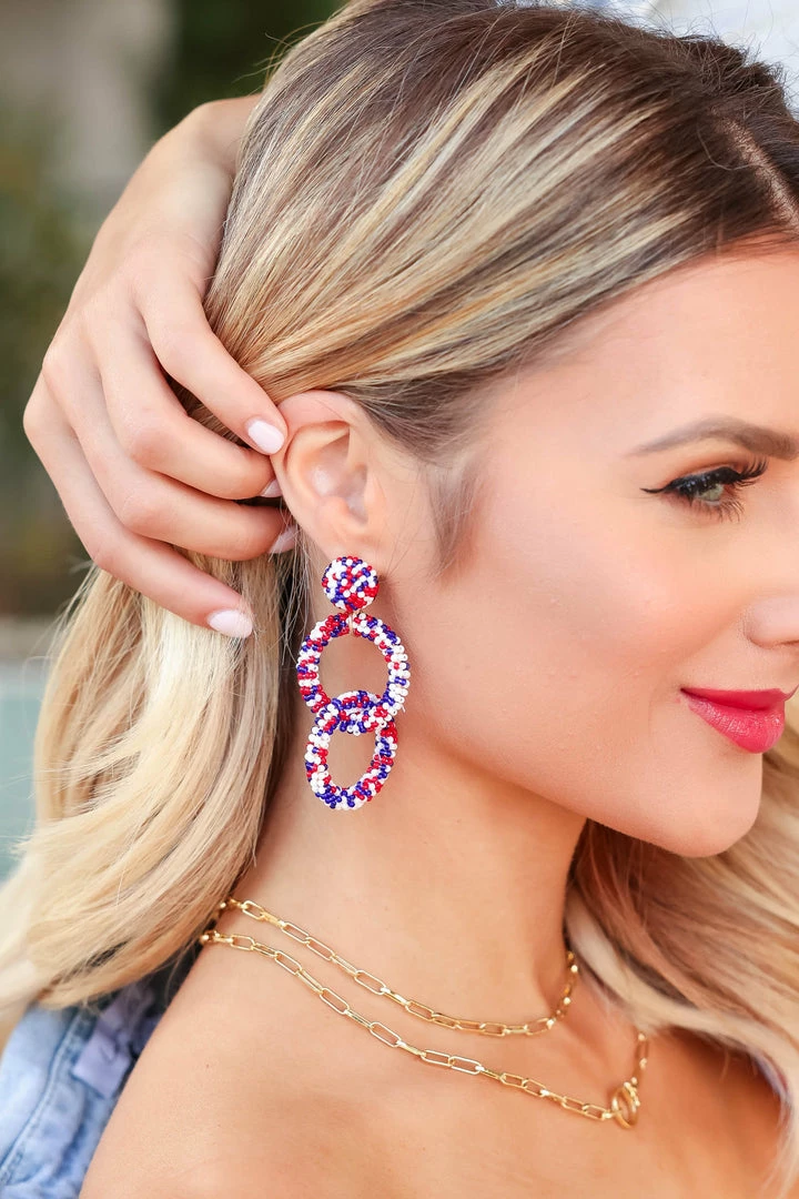 Red, white, and blue, women’s beaded interlocking hoop dangle earrings with push-back closure.