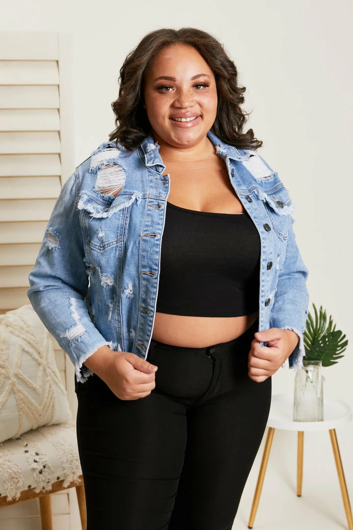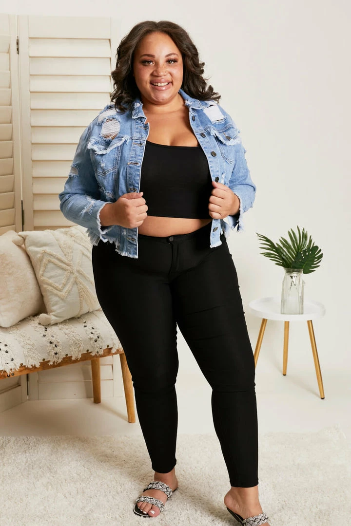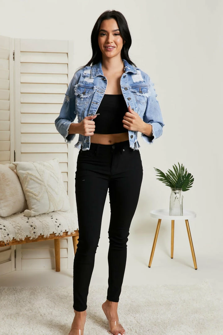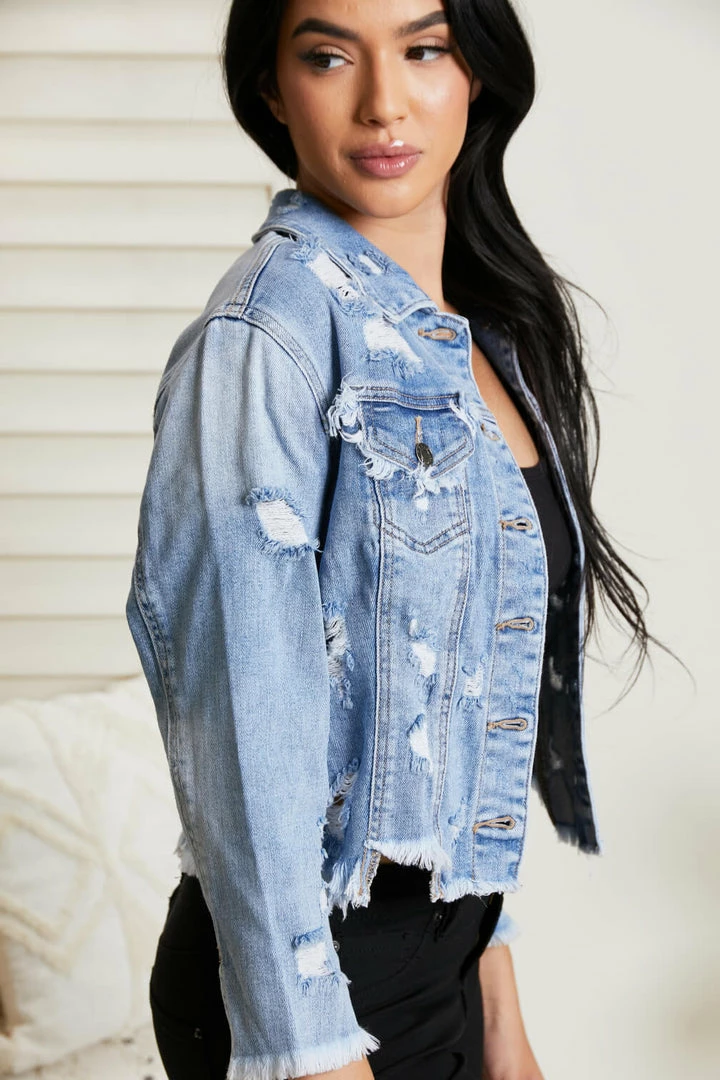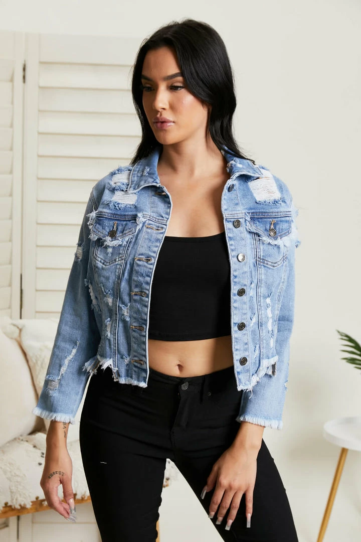 We are obsessed with the edginess that this denim jacket brings! All-over distressing and raw hems make for a unique style, which can be paired with jeans for a denim-on-denim look, joggers, or even dressed up and worn over a dress.