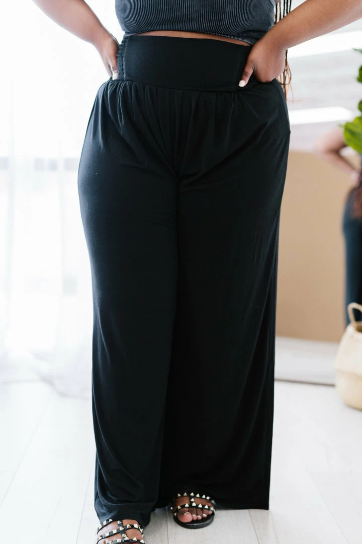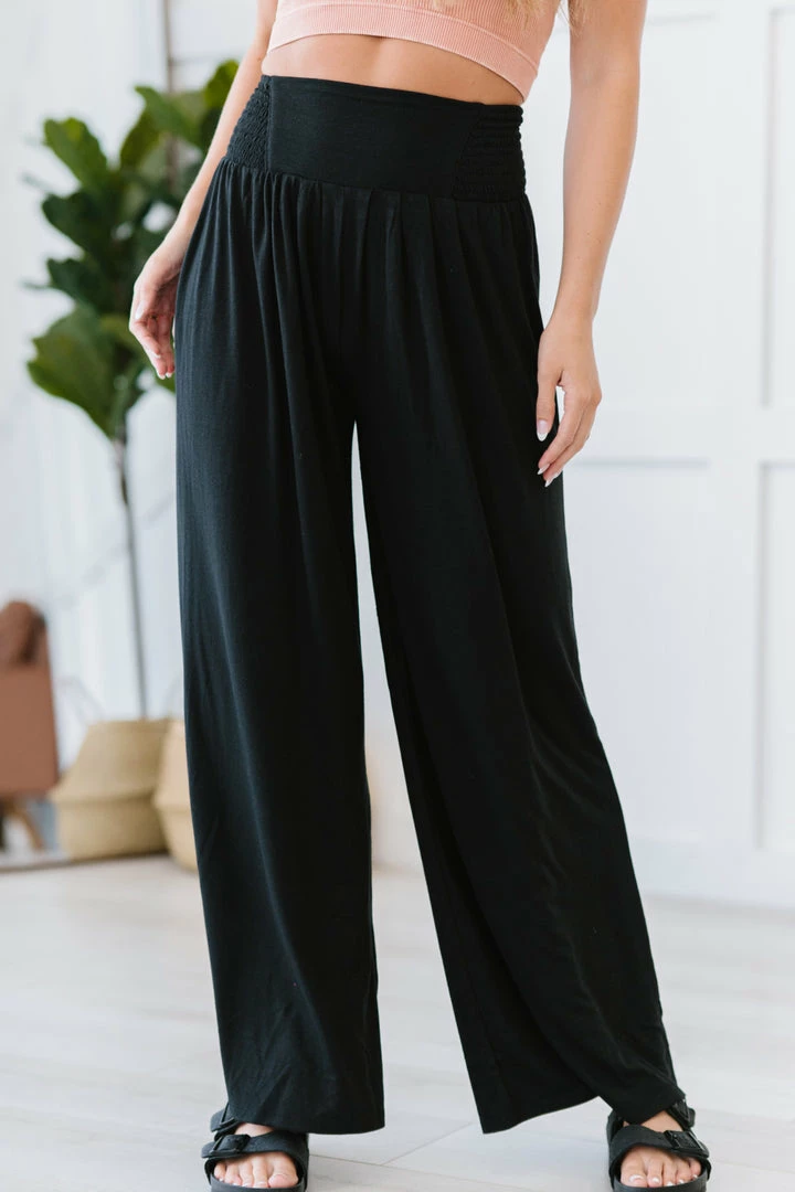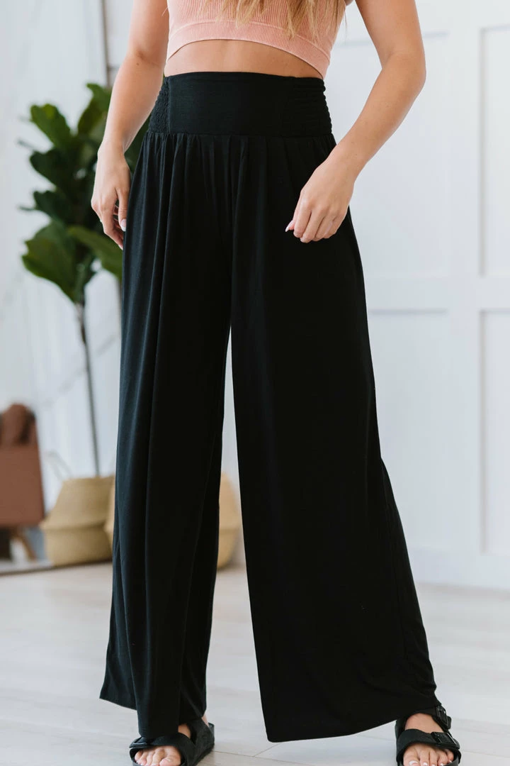 These easy breezy pants are comfy and stylish! A wide leg and smocked waistband shape these full-length palazzo pants. Wear with a crop top and heels, add a blazer and you’re all set!