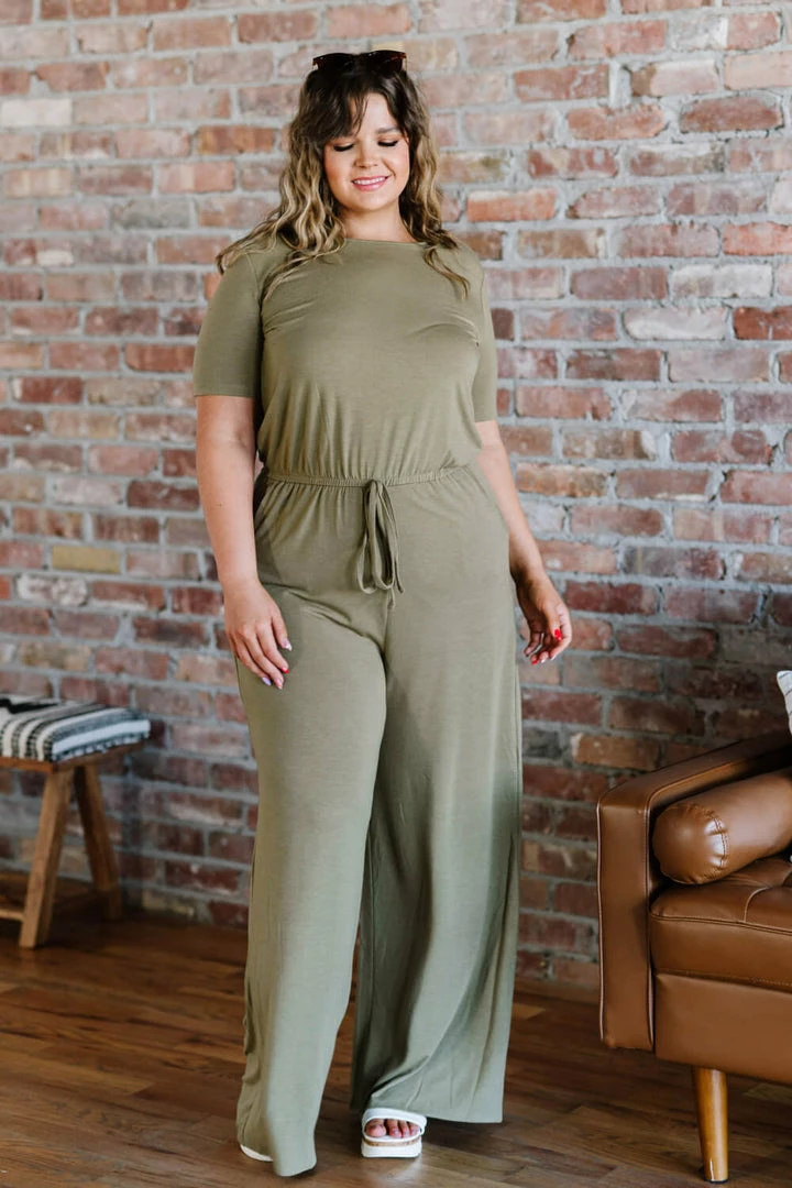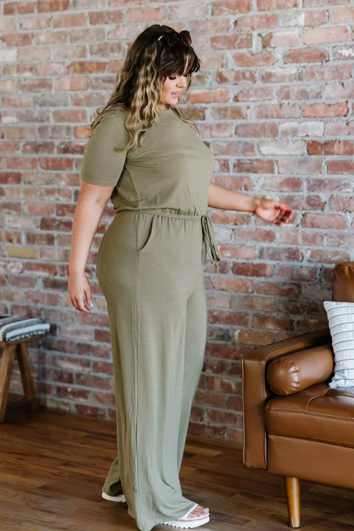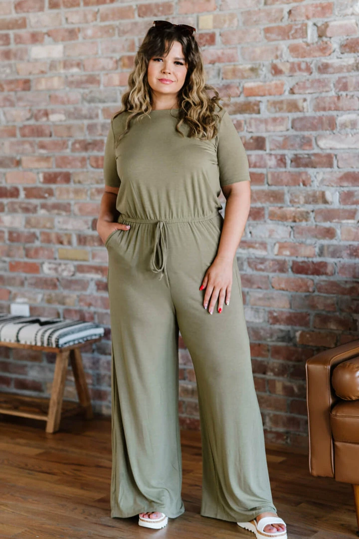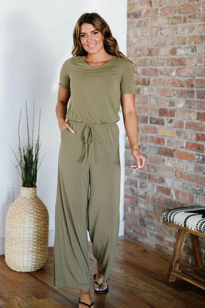 This comfy and stretchy jumpsuit will emphasize your waist with its elastic waistband and decorative tie. It also features a tied keyhole in the back. Throw this on for an easy and no-stress look.