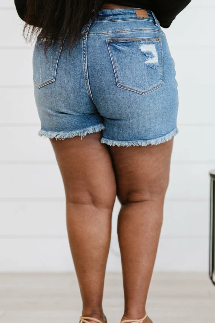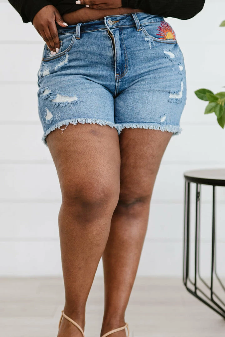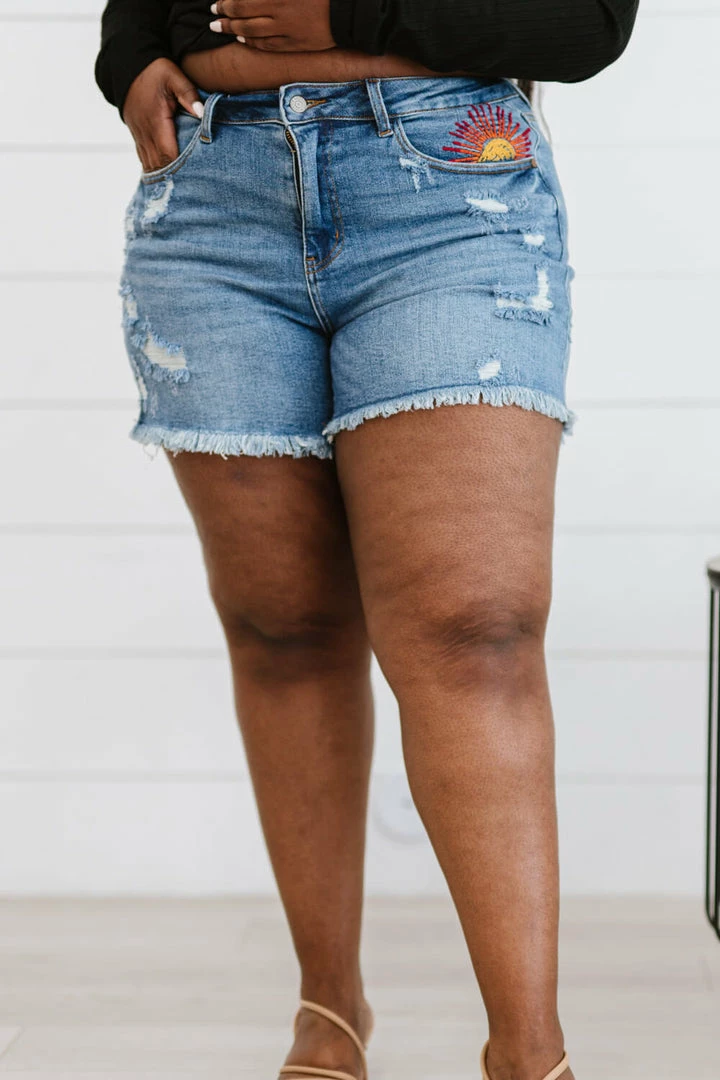 Decorated with summery embroidery, these high-waisted cutoff denim shorts are cut with a flattering fit and feature a playful sun motif embroidered on the pocket. They also feature that feel-good Judy Blue stretch and some distressing details.
