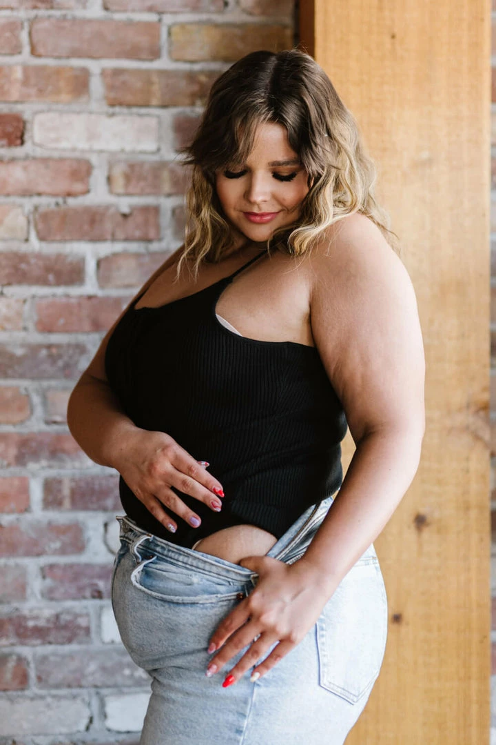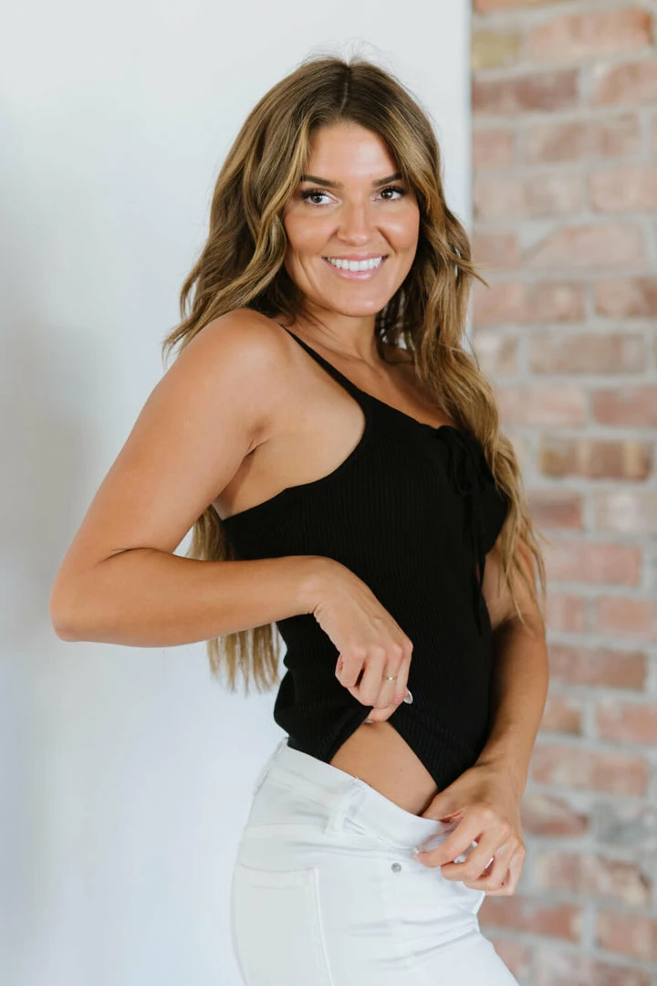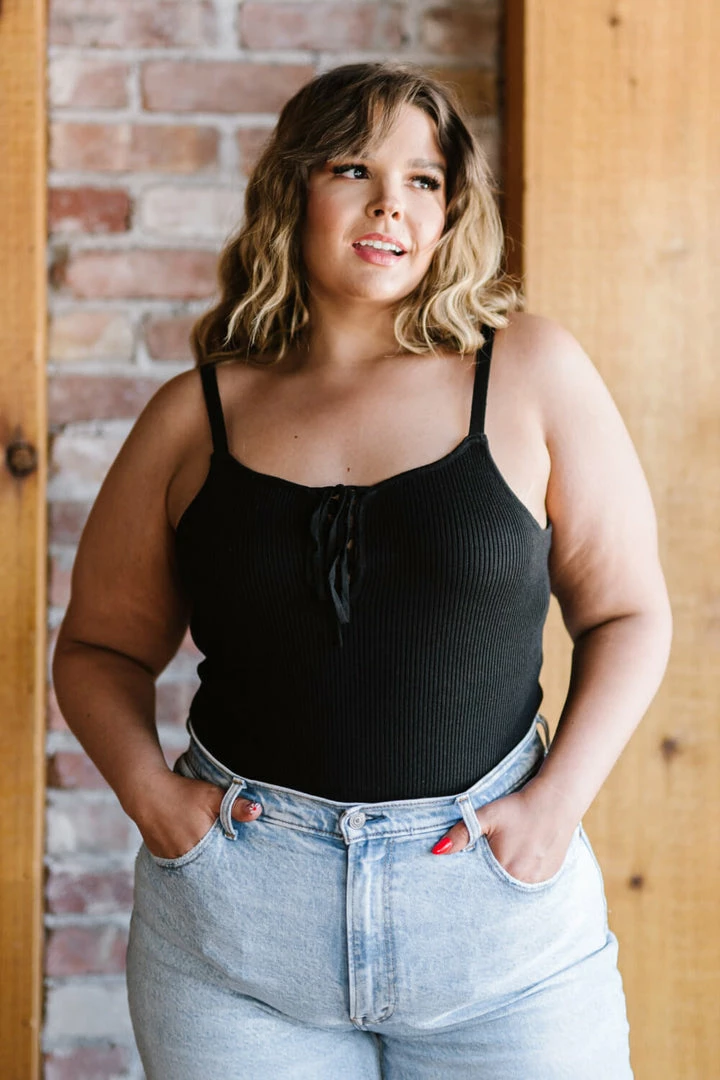 This ribbed bodysuit features a lace-up detail at the neckline. Pair it with jeans, shorts, or a skirt.