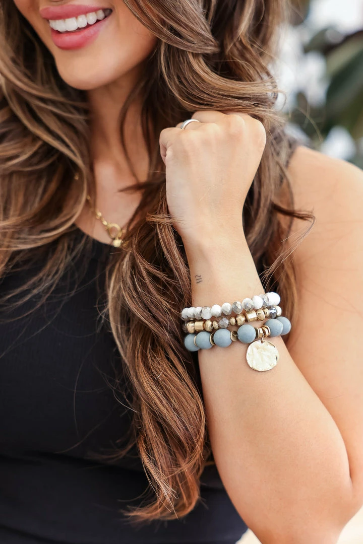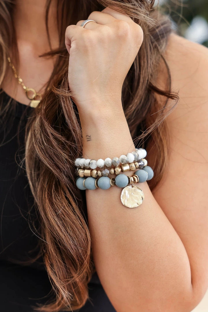 Grey, women’s mixed bead stretch bracelet set with antique golden metal coin charm accent. 3 pieces included in set.
