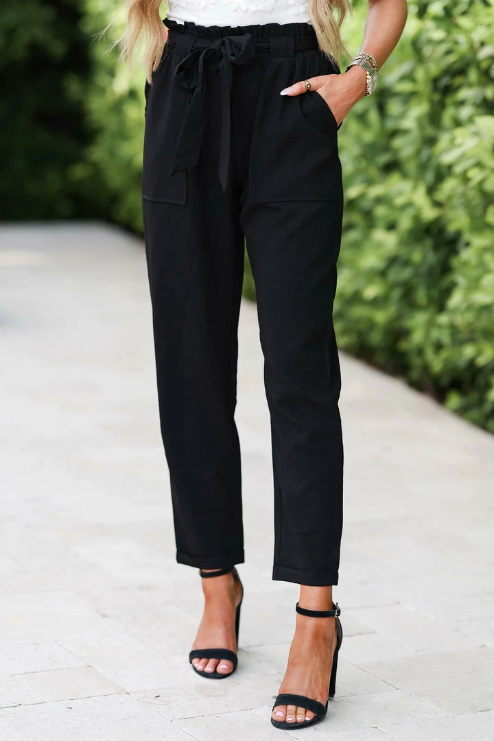 Black, woven pants featuring elastic paper bag waist with removable ribbon belt, side patch pockets and sewn cuffed hem.Â