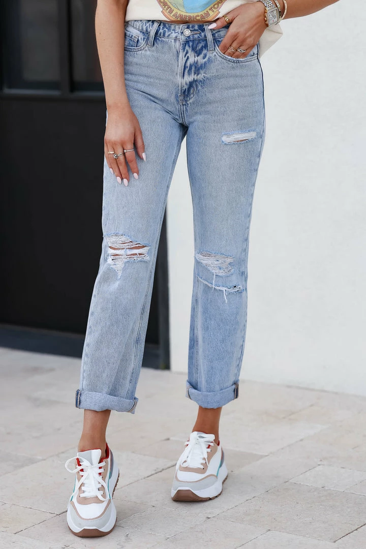 Vervet, light wash, women’s high rise distressed 90’s vintage dad jeans featuring classic 5-pocket design and button zip fly.