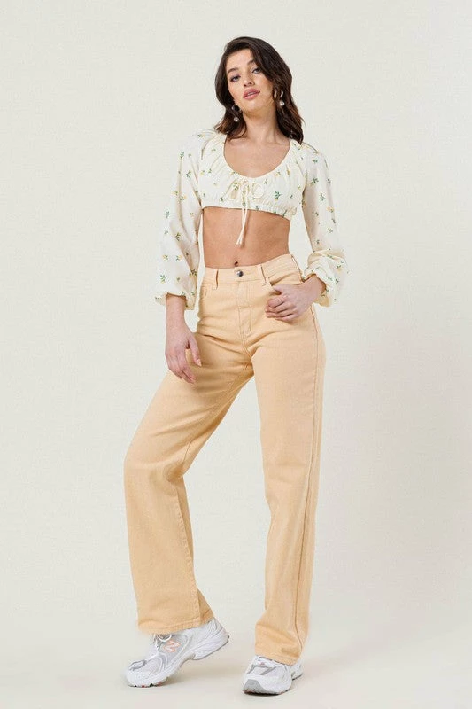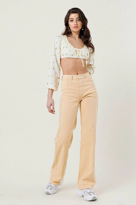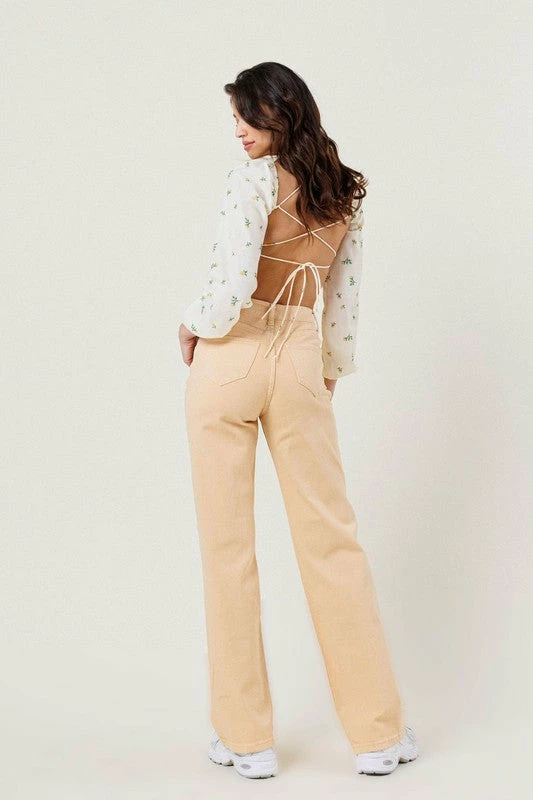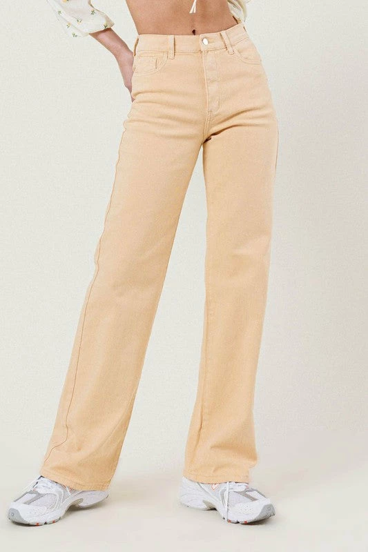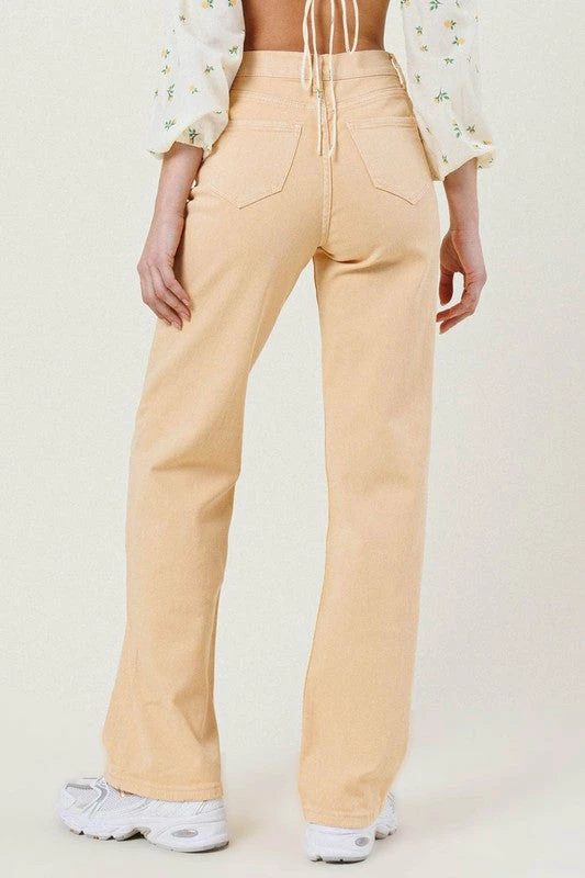A pair of high rise straight fit jeans made out of organic cotton, featuring classic 5 pocket construction, and zip fly closure.