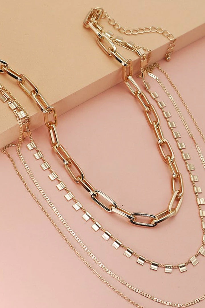 Gold tone, women’s layered necklace featuring four various linked chains and lobster claw closure.