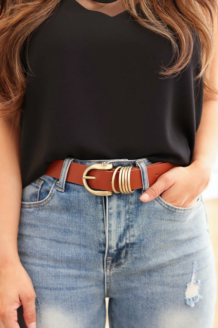 Vegan leather belt with gold rounded buckle and 5 ring detail on the side. *Please note color may vary slightly.