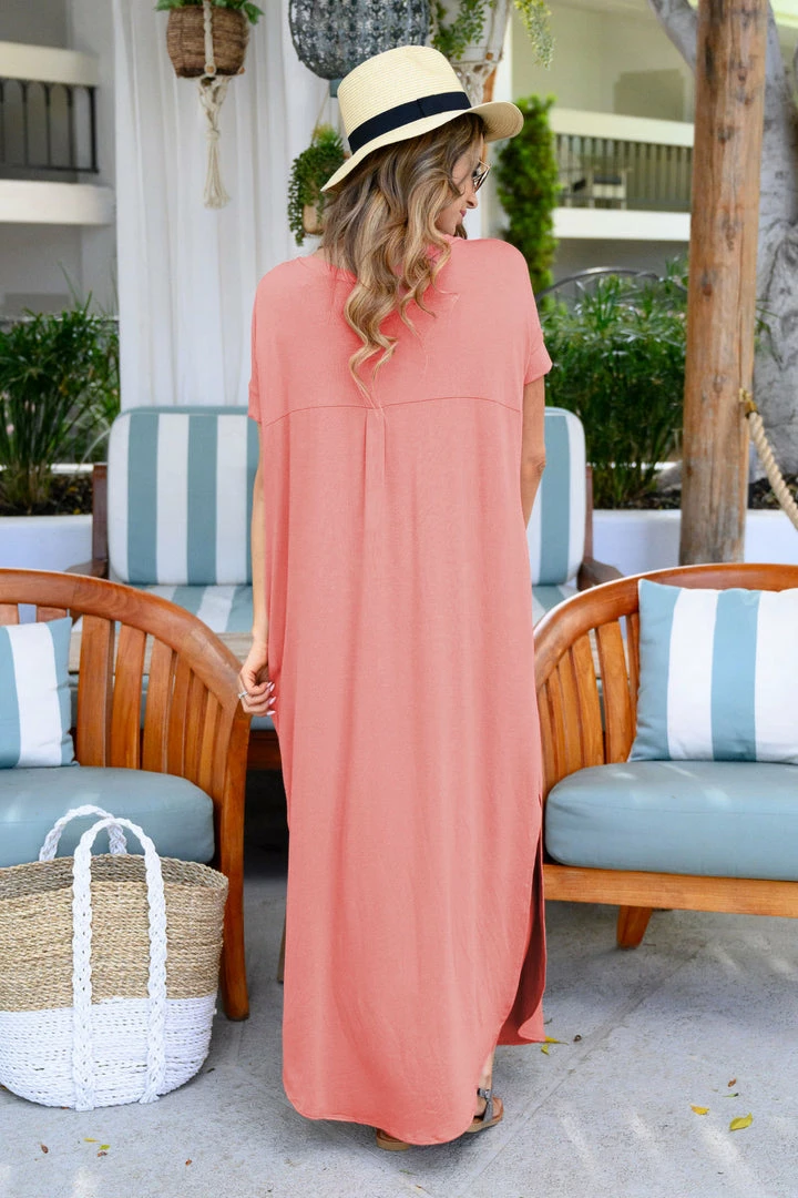Dusty rose, women’s maxi dress featuring v-neckline, short dolman sleeves, side pockets, and rounded bottom hem with side slit detail.