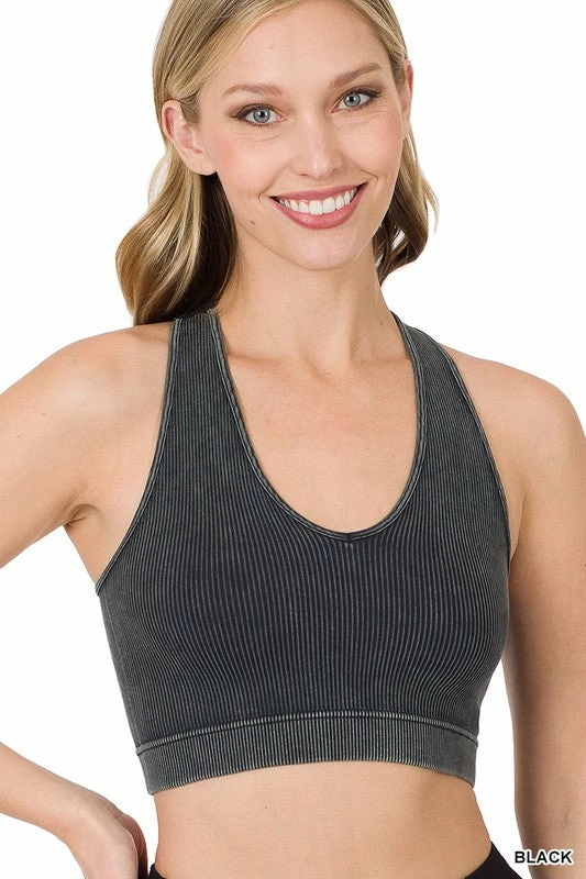 Neon pink, mineral washed, ribbed, cropped tank top featuring v neckline and racerback design.