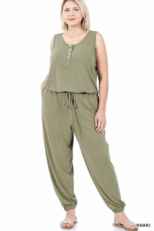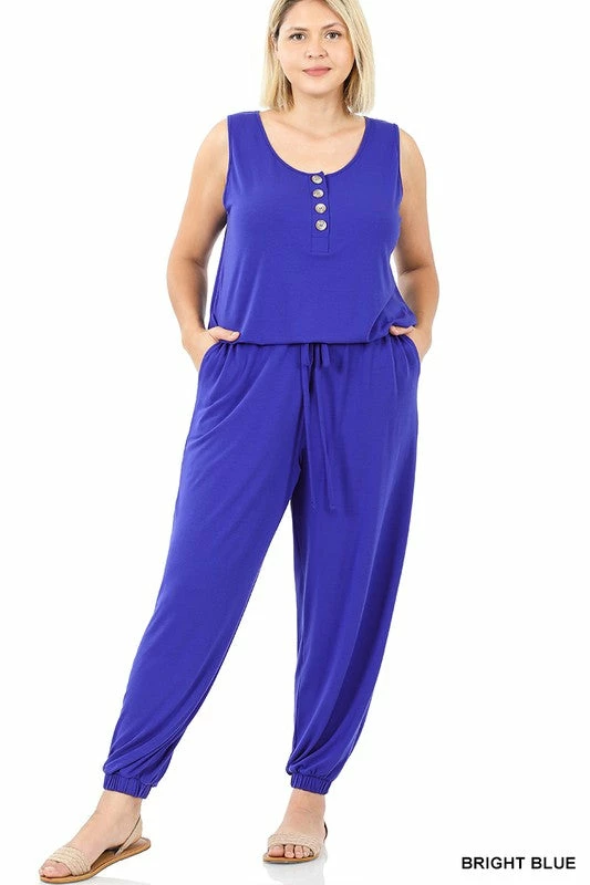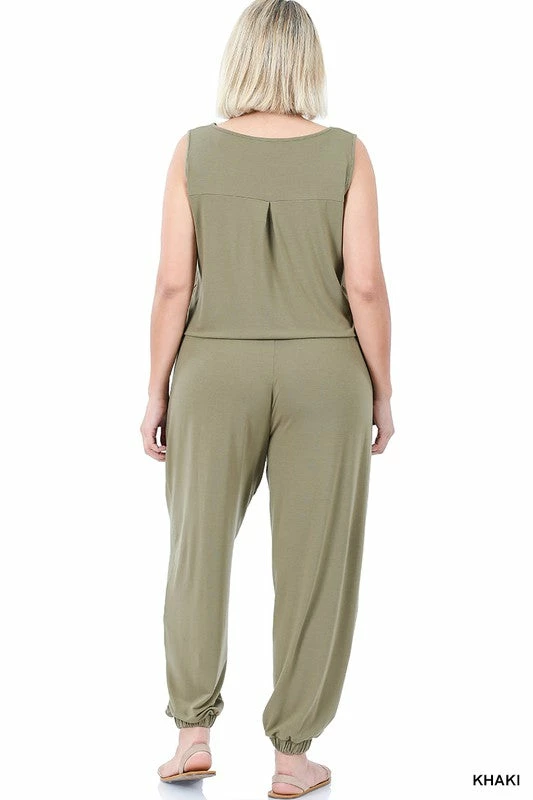 PLUS SLEEVELESS JOGGER JUMPSUIT WITH POCKETS, BUTTONS ARE FUNCTIONAL.