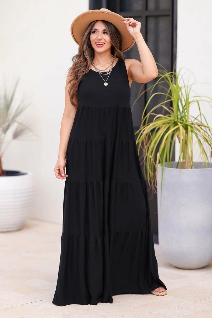 Black, sleeveless maxi dress featuring round neckline and tiered ruffle design.