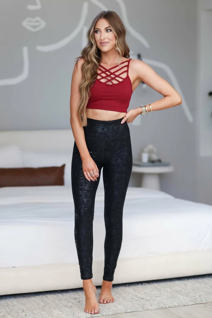 Burgundy, seamless bralette featuring triple cross detail at front neckline and removable bra pads.Â