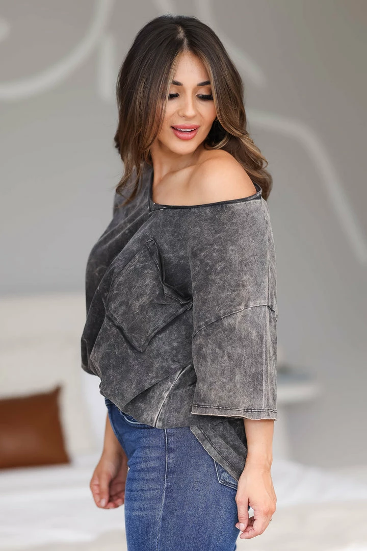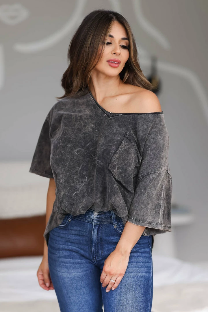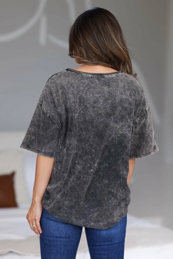 Ash black, short sleeve, acid washed, oversized, boyfriend tee featuring v-neckline, single chest pocket and raw edge details.