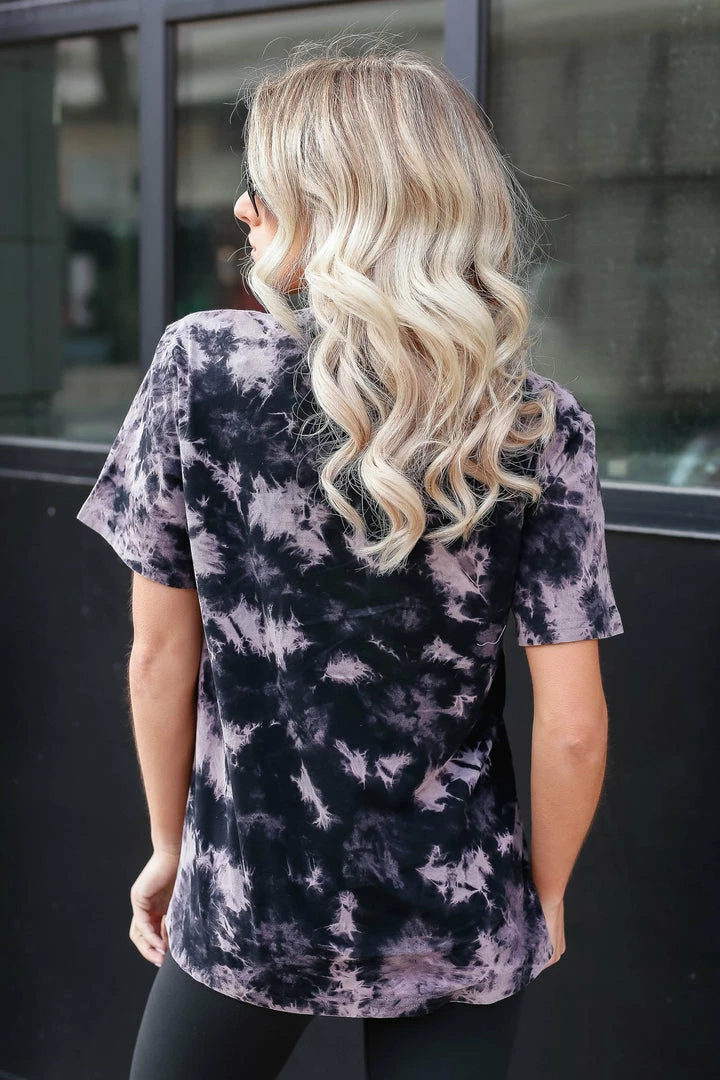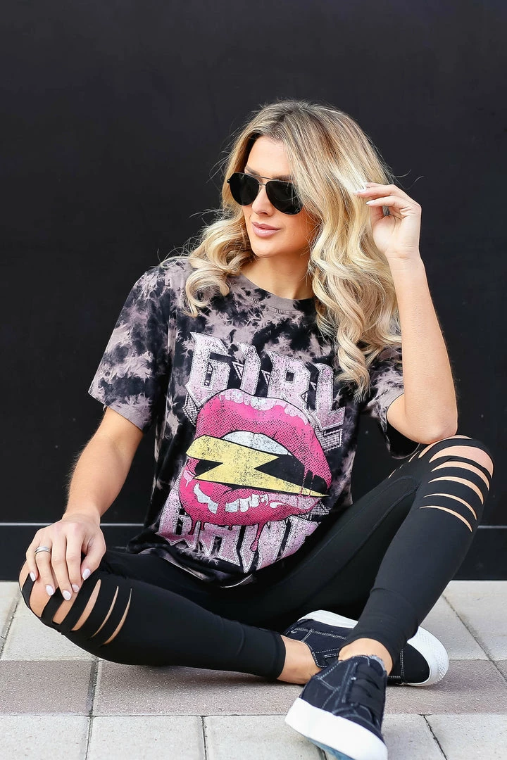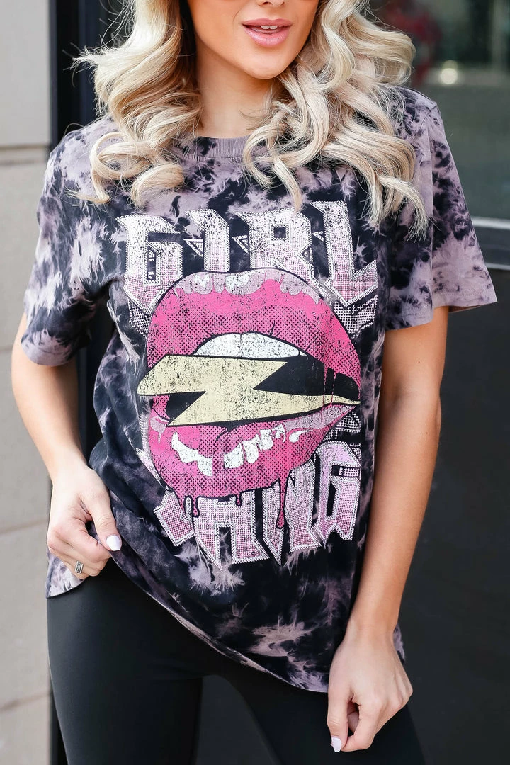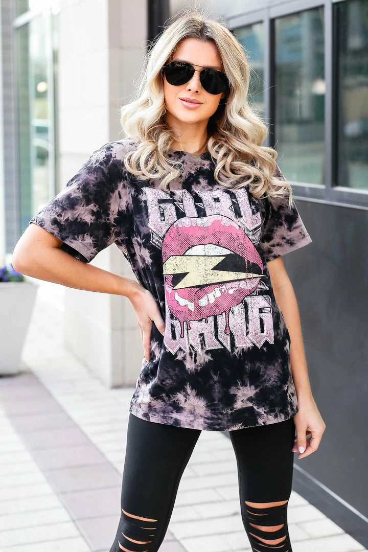 Black, tie-dye, women’s short sleeve tee featuring round neckline and distressed “Girl Gang” graphic on front.